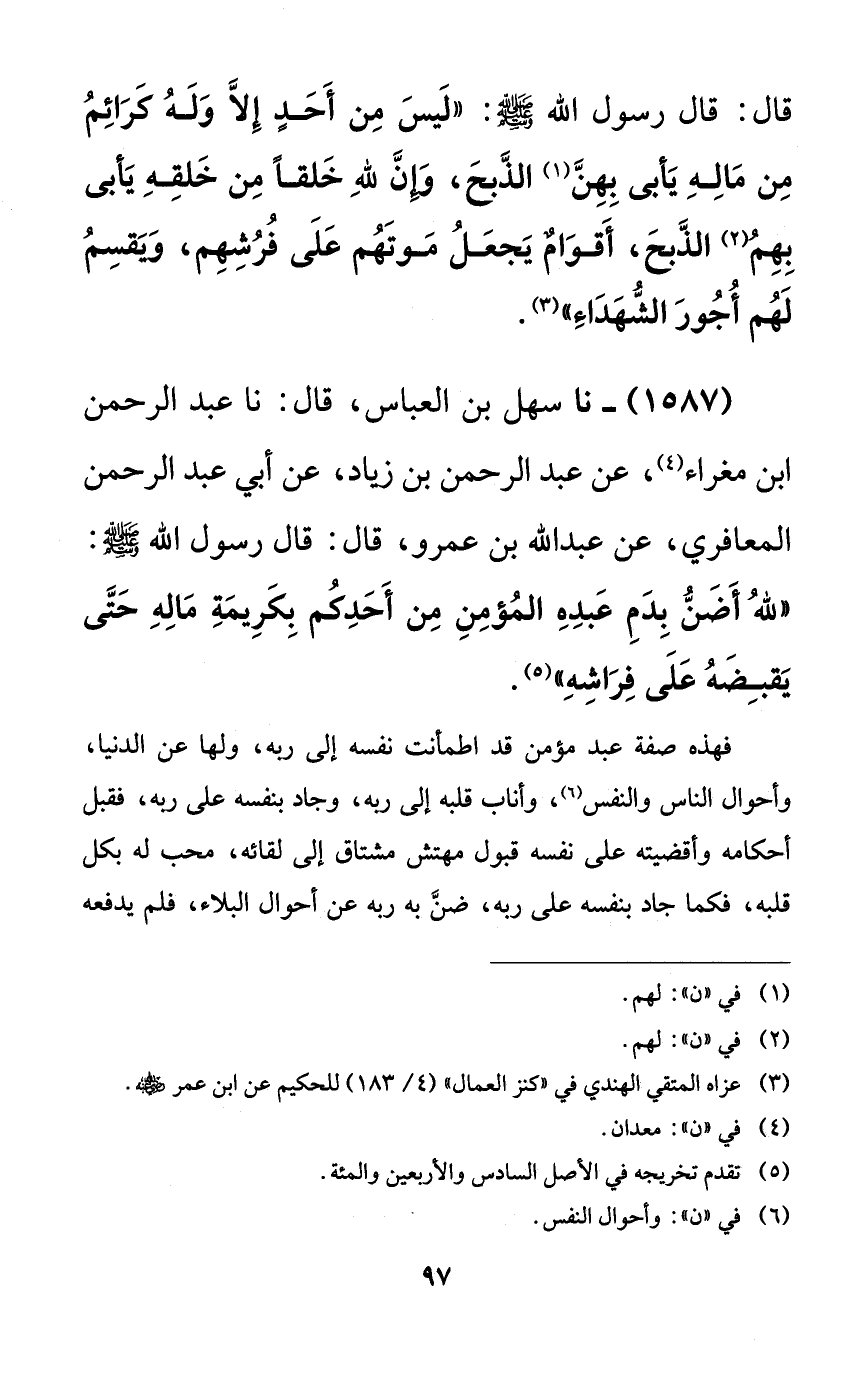 1587 - نا سهل بن العباس، قال: نا عبد الرحمن ابن مغراء، عن عبد الرحمن بن زياد، عن أبي عبد الرحمن المعافري، عن عبد الله بن عمرو قال: قال رسول الله صلى الله عليه وسلم: ((لله أضن بدم عبده المؤمن من أحدكم بكريمة ماله حتى يقبضه على فراشه)).