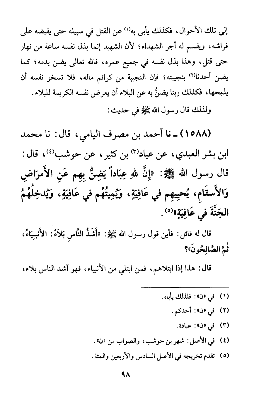 إلى تلك الأحوال، فكذلك يأبى به عن القتل في سبيله حتى يقبضه على فراشه، ويقسم له أجر الشهداء؛ لأن الشهيد إنما بذل نفسه ساعة من نهار حتى قتل، وهذا بذل نفسه في جميع عمره، فالله تعالى يضن بدمه؛ كما يضن أحدنا بنجيبته؛ فإن النجيبة من كرائم ماله، فلا تسخو نفسه أن يذبحها، فكذلك ربنا يضن به عن البلاء أن يعرض نفسه الكريمة للبلاء.