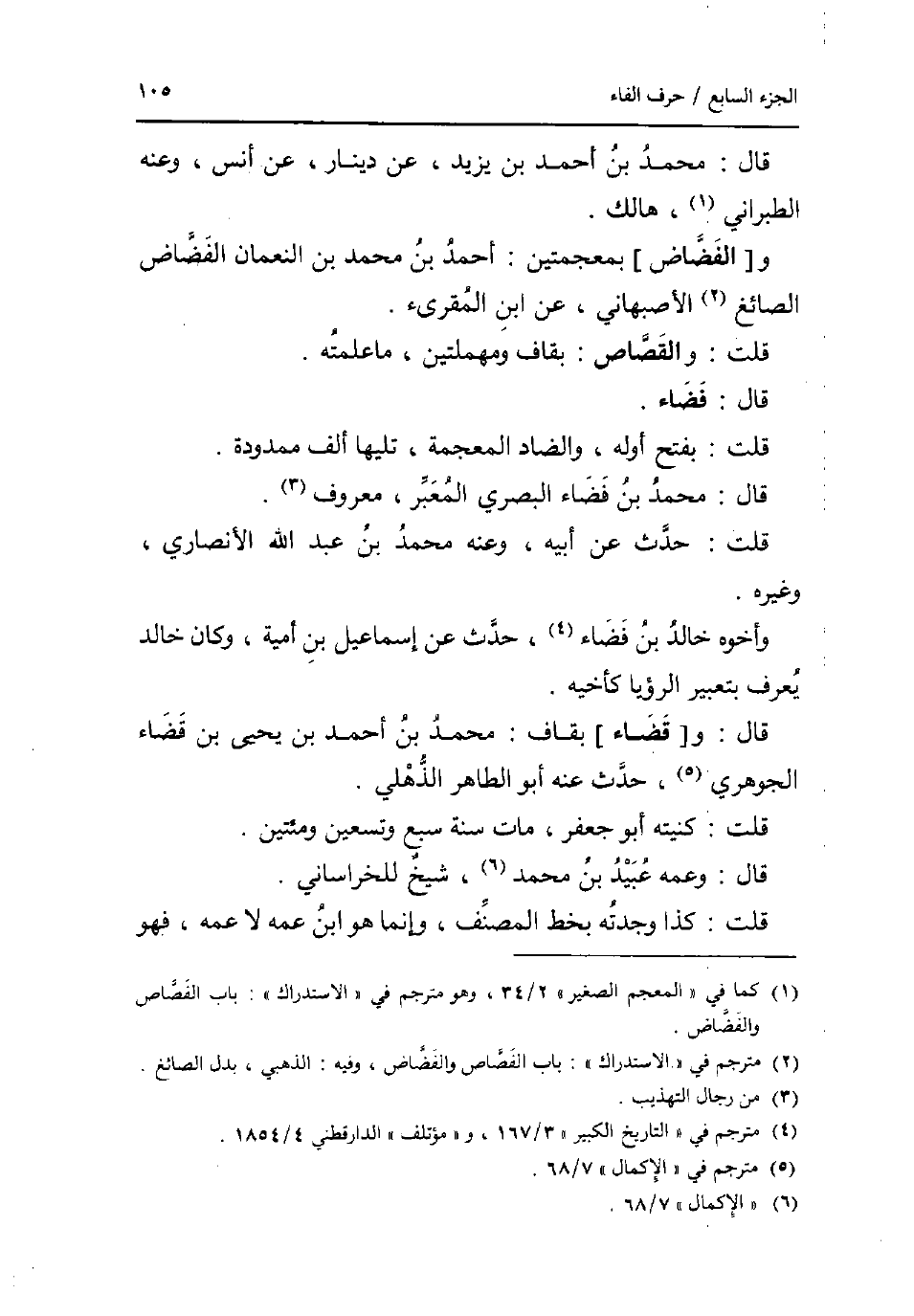 قَالَ: مُحَمَّد بن أَحْمد بن يزِيد عَن دِينَار عَن أنس وَعنهُ الطَّبَرَانِيّ هَالك. و [الفضاض] بمعجمتين: أَحْمد بن مُحَمَّد بن النُّعْمَان الفضاض الصَّائِغ الْأَصْبَهَانِيّ عَن ابْن الْمُقْرِئ. قلت: وَالْقصاص: بقاف ومهملتين مَا عَلمته. قَالَ: فضاء. قلت: بِفَتْح أَوله وَالضَّاد الْمُعْجَمَة تَلِيهَا ألف ممدودة. قَالَ: مُحَمَّد بن فضاء الْبَصْرِيّ الْمعبر مَعْرُوف. قلت: حدث عَن أَبِيه وَعنهُ مُحَمَّد بن عبد الله الْأنْصَارِيّ وَغَيره. وَأَخُوهُ خَالِد بن فضاء حدث عَن إِسْمَاعِيل بن أُميَّة وَكَانَ خَالِد يعرف بتعبير الرُّؤْيَا كأخيه. قَالَ: و [قَضَاء] بقاف: مُحَمَّد بن أَحْمد بن يحيى بن قَضَاء الْجَوْهَرِي حدث عَنهُ أَبُو الطَّاهِر الذهلي. قلت: كنيته أَبُو جَعْفَر مَاتَ سنة سبع وَتِسْعين ومئتين. قَالَ: وَعَمه عبيد بن مُحَمَّد شيخ للخراساني. قلت: كَذَا وجدته بِخَط المُصَنّف وَإِنَّمَا هُوَ ابْن عَمه لَا عَمه فَهُوَ