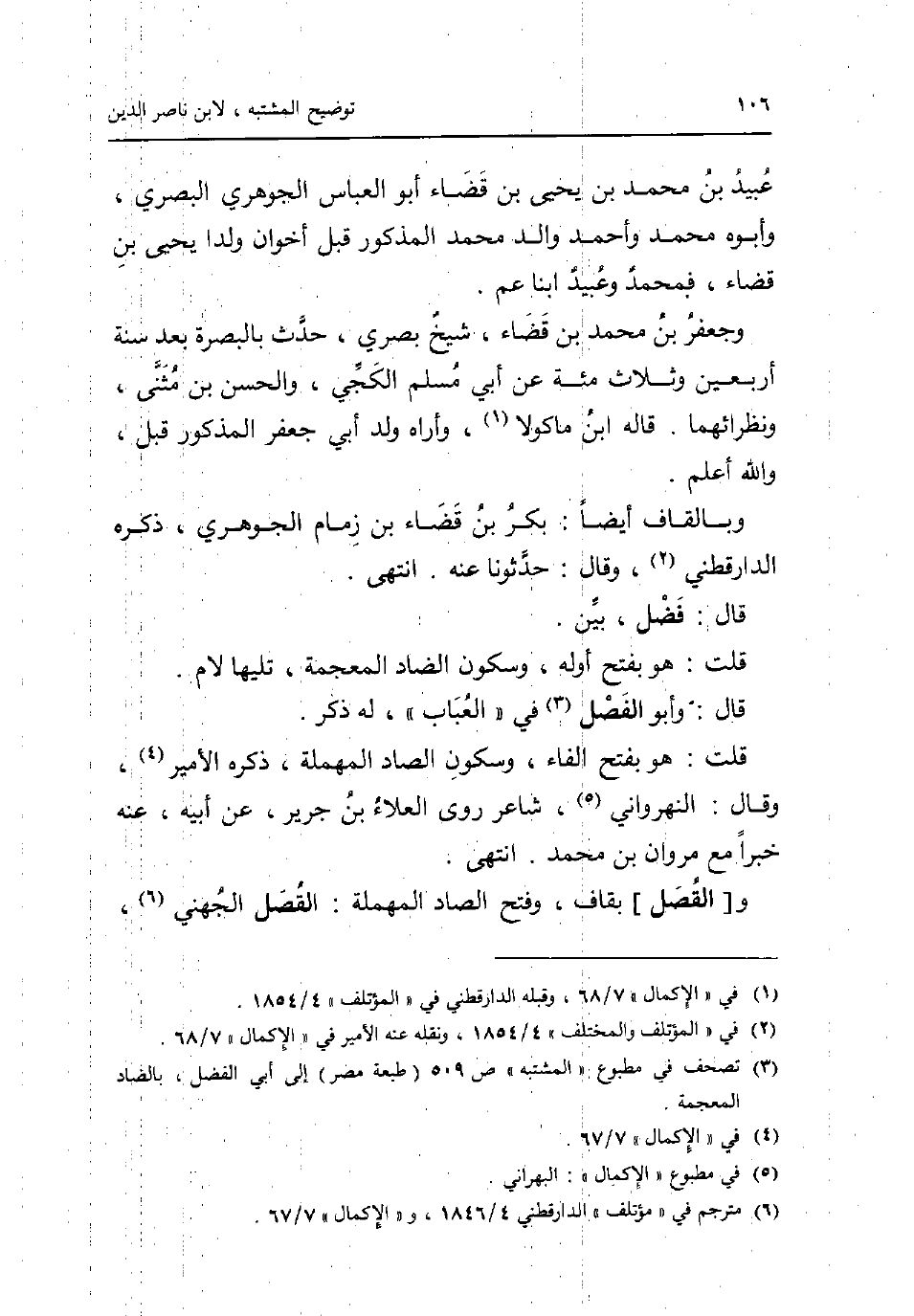 عبيد بن مُحَمَّد بن يحيى بن قَضَاء أَبُو الْعَبَّاس الْجَوْهَرِي الْبَصْرِيّ وَأَبوهُ مُحَمَّد وَأحمد وَالِد مُحَمَّد الْمَذْكُور قبل أَخَوان ولدا يحيى بن قَضَاء فمحمد وَعبيد ابْنا عَم. وجعفر بن مُحَمَّد بن قَضَاء شيخ بَصرِي حدث بِالْبَصْرَةِ بعد سنة أَرْبَعِينَ وَثَلَاث مئة عَن أبي مُسلم الْكَجِّي وَالْحسن بن مثنى ونظرائهما. قَالَه ابْن مَاكُولَا وَأرَاهُ ولد أبي جَعْفَر الْمَذْكُور قبل وَالله أعلم. وبالقاف أَيْضا: بكر بن قَضَاء بن زِمَام الْجَوْهَرِي ذكره الدَّارَقُطْنِيّ وَقَالَ: حدثونا عَنهُ. انْتهى. قَالَ: فضل بَين. قلت: هُوَ بِفَتْح أَوله وَسُكُون الضَّاد الْمُعْجَمَة تَلِيهَا لَام. قَالَ: وَأَبُو الْفَصْل فِي الْعباب لَهُ ذكر. قلت: هُوَ بِفَتْح الْفَاء وَسُكُون الصَّاد الْمُهْملَة ذكره الْأَمِير وَقَالَ: النهرواني شَاعِر روى الْعَلَاء بن جرير عَن أَبِيه عَنهُ خَبرا مَعَ مَرْوَان بن مُحَمَّد. انْتهى. و [القصل] بقاف وَفتح الصَّاد الْمُهْملَة: القصل الْجُهَنِيّ
