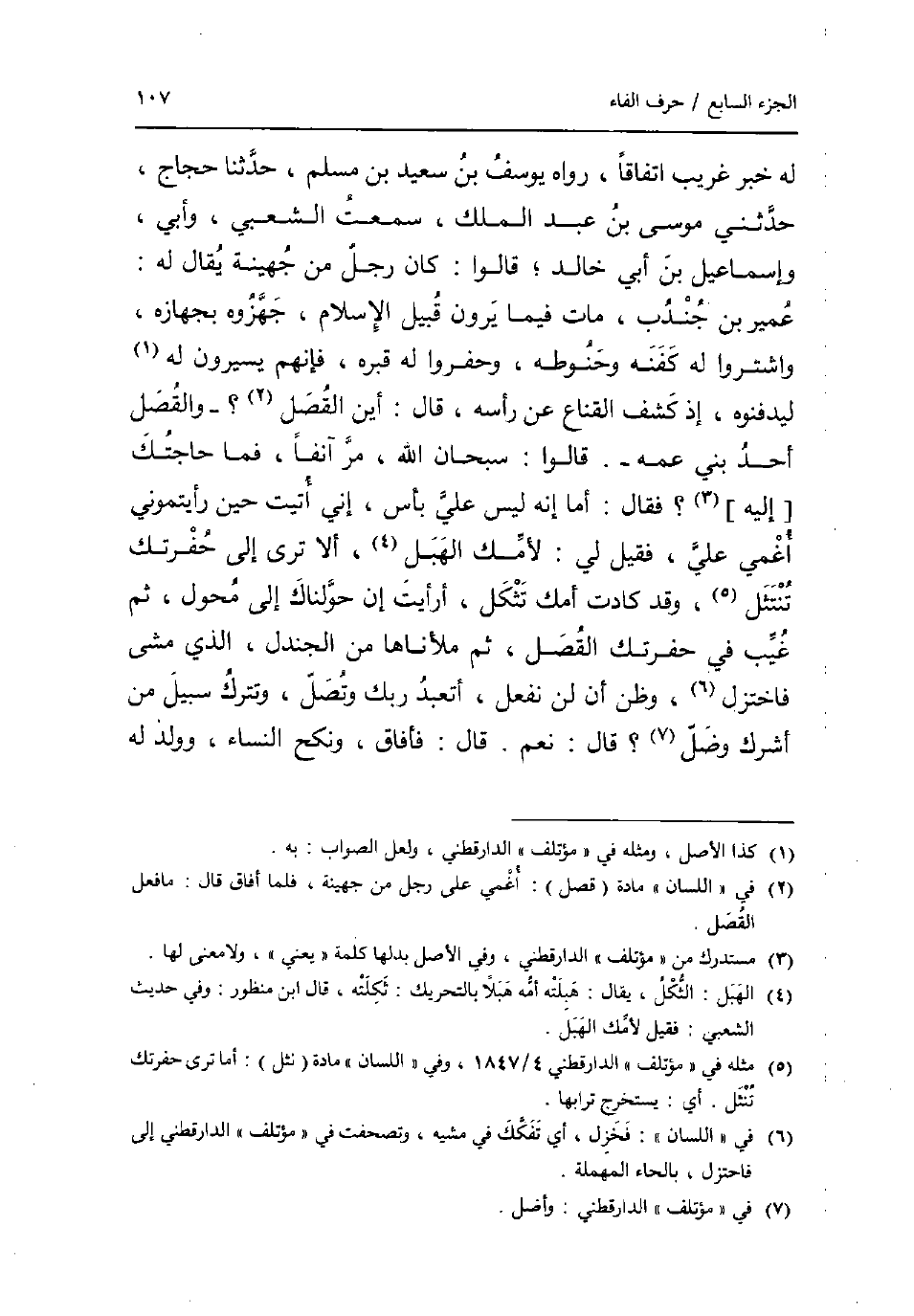 لَهُ خبر غَرِيب اتِّفَاقًا رَوَاهُ يُوسُف بن سعيد بن مُسلم حَدثنَا حجاج حَدثنِي مُوسَى بن عبد الْملك سَمِعت الشّعبِيّ وَأبي وَإِسْمَاعِيل بن أبي خَالِد؛ قَالُوا: كَانَ رجل من جُهَيْنَة يُقَال لَهُ: عُمَيْر بن جُنْدُب مَاتَ فِيمَا يرَوْنَ قبيل الْإِسْلَام جهزوه بجهازه واشتروا لَهُ كَفنه وحنوطه وحفروا لَهُ قَبره فَإِنَّهُم يَسِيرُونَ لَهُ ليدفنوه إِذْ كشف القناع عَن رَأسه قَالَ: أَيْن القصل؟ _ والقصل أحد بني عَمه _. قَالُوا: سُبْحَانَ الله مر آنِفا فَمَا حَاجَتك [إِلَيْهِ] ؟ فَقَالَ: أما إِنَّه لَيْسَ عَليّ بَأْس إِنِّي أتيت حِين رَأَيْتُمُونِي أُغمي عَليّ فَقيل لي: لأمك الهبل أَلا ترى إِلَى حفرتك تنتثل وَقد كَادَت أمك تثكل أَرَأَيْت إِن حولناك إِلَى محول ثمَّ غيب فِي حفرتك القصل ثمَّ ملأناها من الجندل الَّذِي مَشى فاختزل وَظن أَن لن نَفْعل أَتَعبد رَبك وَتصل وتترك سَبِيل من أشرك وضل؟ قَالَ: نعم. قَالَ: فأفاق ونكح النِّسَاء وَولد لَهُ