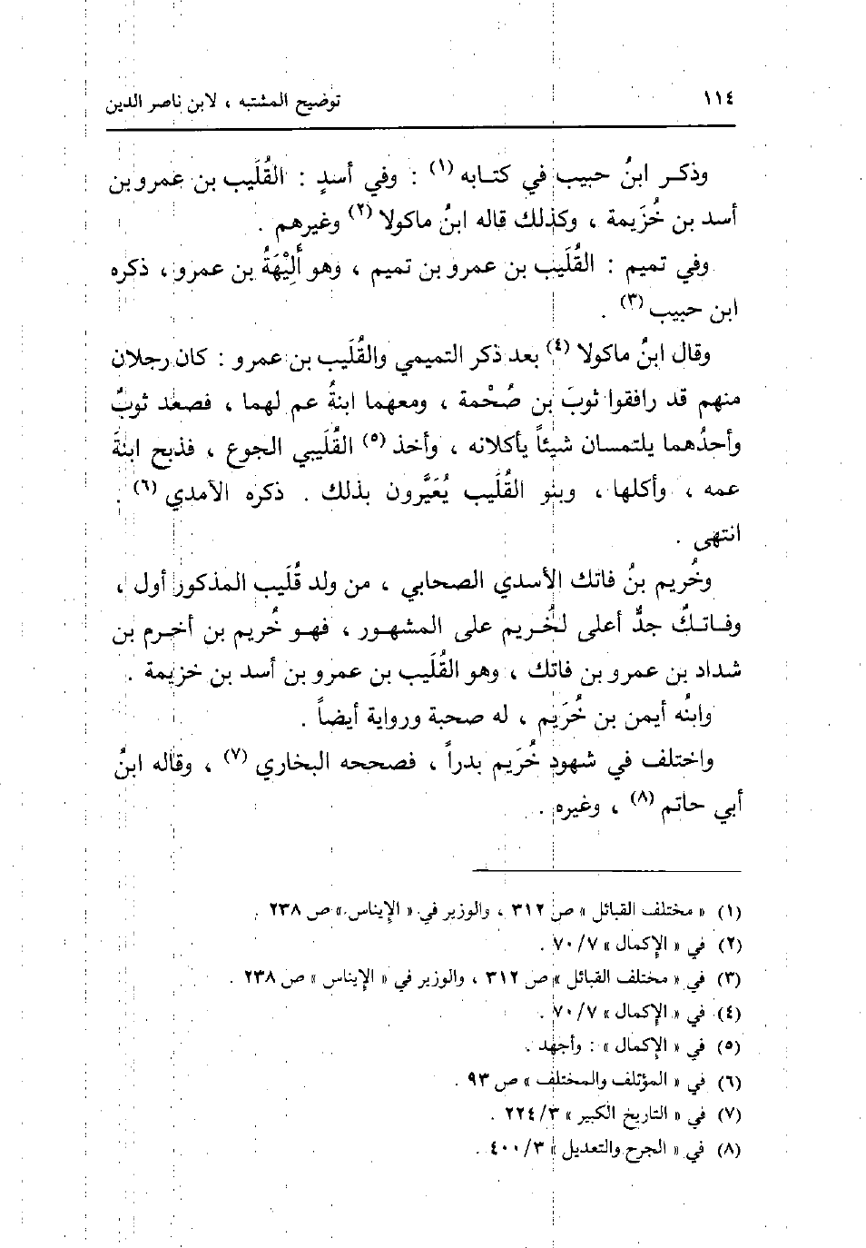 وَذكر ابْن حبيب فِي كِتَابه: وَفِي أَسد: القليب بن عَمْرو بن أَسد بن خُزَيْمَة وَكَذَلِكَ قَالَه ابْن مَاكُولَا وَغَيرهم. وَفِي تَمِيم: القليب بن عَمْرو بن تَمِيم وَهُوَ أليهة بن عَمْرو ذكره ابْن حبيب. وَقَالَ ابْن مَاكُولَا بعد ذكر التَّمِيمِي والقليب بن عَمْرو: كَانَ رجلَانِ مِنْهُم قد رافقوا ثوب بن صحمة ومعهما ابْنة عَم لَهما فَصَعدَ ثوب وَأَحَدهمَا يلتمسان شَيْئا يأكلانه وَأخذ القليبي الْجُوع فذبح ابْنة عَمه وأكلها وَبَنُو القليب يعيرون بذلك. ذكره الْآمِدِيّ. انْتهى. وخريم بن فاتك الْأَسدي الصَّحَابِيّ من ولد قليب الْمَذْكُور أول وفاتك جد أَعلَى لخريم على الْمَشْهُور فَهُوَ خريم بن أخرم بن شَدَّاد بن عَمْرو بن فاتك وَهُوَ القليب بن عَمْرو بن أَسد بن خُزَيْمَة. وَابْنه أَيمن بن خريم لَهُ صُحْبَة وَرِوَايَة أَيْضا. وَاخْتلف فِي شُهُود خريم بَدْرًا فصححه البُخَارِيّ وَقَالَهُ ابْن أبي حَاتِم وَغَيره.