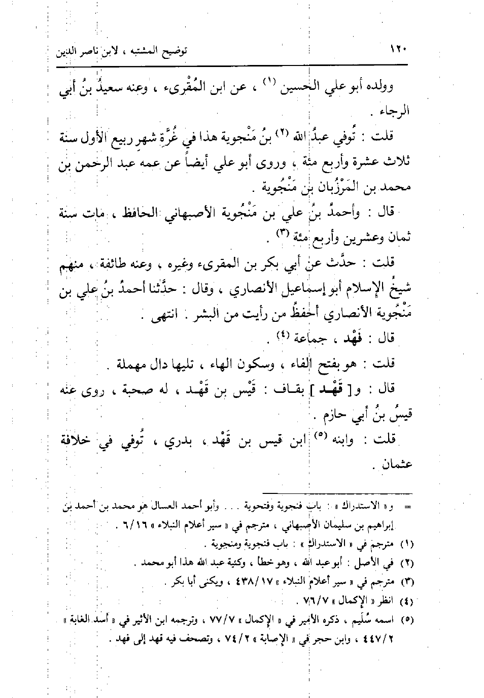 وَولده أَبُو عَليّ الْحُسَيْن عَن ابْن الْمُقْرِئ وَعنهُ سعيد بن أبي الرَّجَاء. قلت: توفّي عبد الله بن منجوية هَذَا فِي غرَّة شهر ربيع الأول سنة ثَلَاث عشرَة وَأَرْبع مئة وروى أَبُو عَليّ أَيْضا عَن عَمه عبد الرَّحْمَن بن مُحَمَّد بن الْمَرْزُبَان بن منجوية. قَالَ: وَأحمد بن عَليّ بن منجوية الْأَصْبَهَانِيّ الْحَافِظ مَاتَ سنة ثَمَان وَعشْرين وَأَرْبع مئة. قلت: حدث عَن أبي بكر بن الْمُقْرِئ وَغَيره وَعنهُ طَائِفَة مِنْهُم شيخ الْإِسْلَام أَبُو إِسْمَاعِيل الْأنْصَارِيّ وَقَالَ: حَدثنَا أَحْمد بن عَليّ بن منجوية الْأنْصَارِيّ أحفظ من رَأَيْت من الْبشر. انْتهى. قَالَ: فَهد جمَاعَة. قلت: هُوَ بِفَتْح الْفَاء وَسُكُون الْهَاء تَلِيهَا دَال مُهْملَة. قَالَ: و [قهد] بقاف: قيس بن قهد لَهُ صُحْبَة روى عَنهُ قيس بن أبي حَازِم. قلت: وَابْنه ابْن قيس بن قهد بَدْرِي توفّي فِي خلَافَة عُثْمَان.