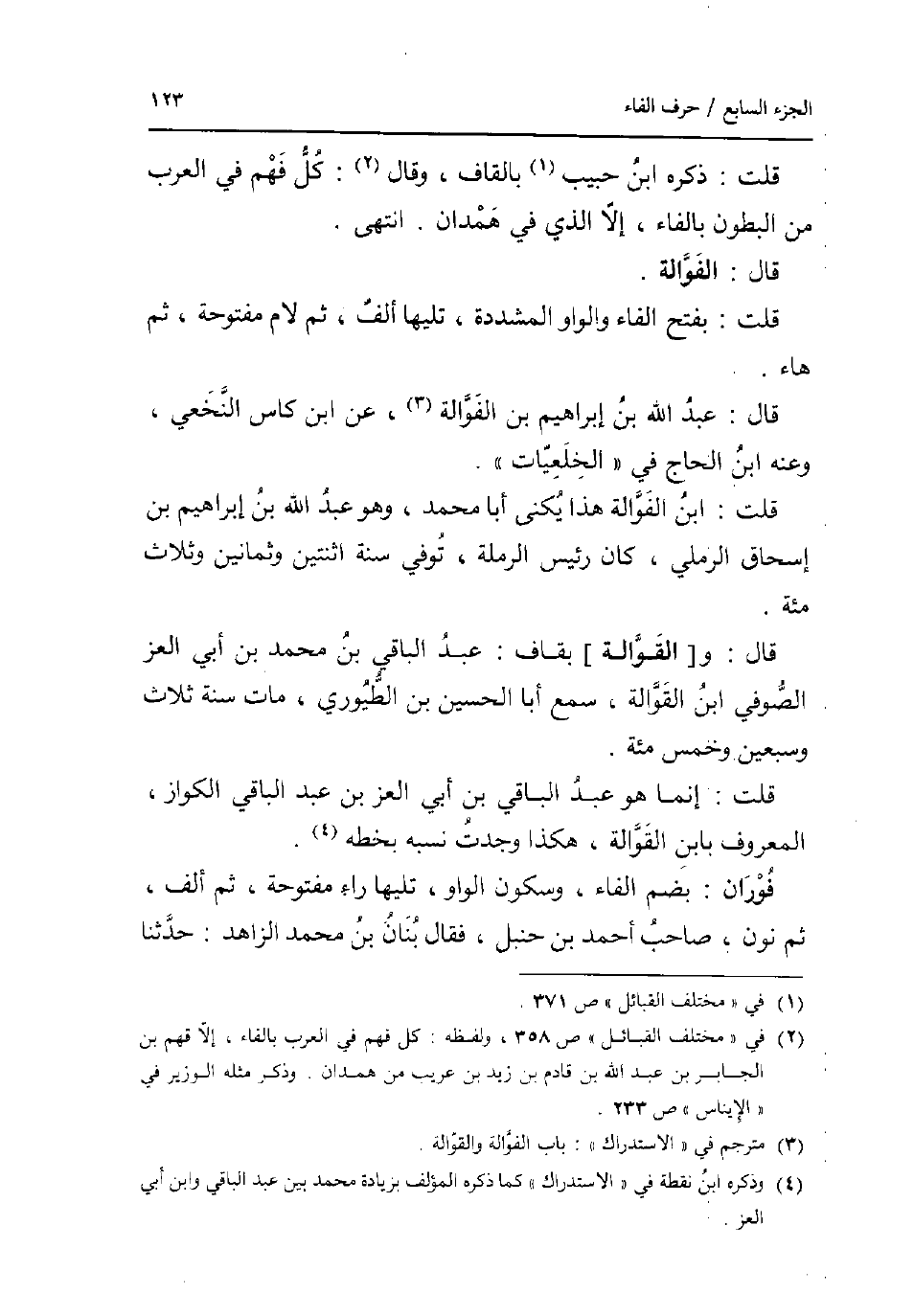 قلت: ذكره ابْن حبيب بِالْقَافِ وَقَالَ: كل فهم فِي الْعَرَب من الْبُطُون بِالْفَاءِ إِلَّا الَّذِي فِي هَمدَان. انْتهى. قَالَ: الفوالة. قلت: بِفَتْح الْفَاء وَالْوَاو الْمُشَدّدَة تَلِيهَا ألف ثمَّ لَام مَفْتُوحَة ثمَّ هَاء. قَالَ: عبد الله بن إِبْرَاهِيم بن الفوالة عَن ابْن كاس النَّخعِيّ وَعنهُ ابْن الْحَاج فِي الخلعيات. قلت: ابْن الفوالة هَذَا يكنى أَبَا مُحَمَّد وَهُوَ عبد الله بن إِبْرَاهِيم بن إِسْحَاق الرَّمْلِيّ كَانَ رَئِيس الرملة توفّي سنة اثْنَتَيْنِ وَثَمَانِينَ وَثَلَاث مئة. قَالَ: و [القوالة] بقاف: عبد الْبَاقِي بن مُحَمَّد بن أبي الْعِزّ الصُّوفِي ابْن القوالة سمع أَبَا الْحُسَيْن بن الطيوري مَاتَ سنة ثَلَاث وَسبعين وَخمْس مئة. قلت: إِنَّمَا هُوَ عبد الْبَاقِي بن أبي الْعِزّ بن عبد الْبَاقِي الكواز الْمَعْرُوف بِابْن القوالة هَكَذَا وجدت نسبه بِخَطِّهِ. فوران: بِضَم الْفَاء وَسُكُون الْوَاو تَلِيهَا رَاء مَفْتُوحَة ثمَّ ألف ثمَّ نون صَاحب أَحْمد بن حَنْبَل فَقَالَ بنان بن مُحَمَّد الزَّاهِد: حَدثنَا