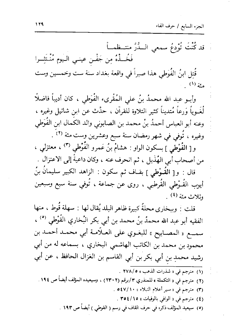 قتل ابْن الفوطي هَذَا صبرا فِي وَاقعَة بَغْدَاد سنة سِتّ وَخمسين وست مئة. وَأَبُو عبد الله مُحَمَّد بن عَليّ الْمُقْرِئ الفوطي كَانَ أديبا فَاضلا لغويا ورعا متدينا كثير التِّلَاوَة لِلْقُرْآنِ حدث عَن ابْن شاتيل وَغَيره وَعنهُ أَبُو الْعَبَّاس أَحْمد بن مُحَمَّد بن الصَّابُونِي وَالِد الْكَمَال ابْن الفوطي وَغَيره توفّي فِي شهر رَمَضَان سنة سبع وَعشْرين وست مئة. و [الفوطي] بِسُكُون الْوَاو: هِشَام بن عَمْرو الفوطي معتزلي من أَصْحَاب أبي الْهُذيْل ثمَّ انحرف عَنهُ وَكَانَ دَاعِيَة إِلَى الاعتزال. قَالَ: و [القوطي] بقاف ثمَّ سُكُون: الزَّاهِد الْكَبِير سُلَيْمَان بن أَيُّوب القوطي الْقُرْطُبِيّ روى عَن جمَاعَة توفّي سنة سبع وَسبعين وَثَلَاث مئة. قلت وببخارى محلّة كَبِيرَة ظَاهر الْبَلَد يُقَال لَهَا: سهلة قوط مِنْهَا الْفَقِيه أَبُو عبد الله مُحَمَّد بن مُحَمَّد بن أبي بكر البُخَارِيّ القوطي سمع المصابيح لِلْبَغوِيِّ على الْعَلامَة أبي مُحَمَّد أَحْمد بن مَحْمُود بن مُحَمَّد بن الْكَاتِب الْهَاشِمِي البُخَارِيّ بِسَمَاعِهِ لَهُ من أبي رشيد مُحَمَّد بن أبي بكر بن أبي الْقَاسِم بن الغزال الْحَافِظ عَن أبي