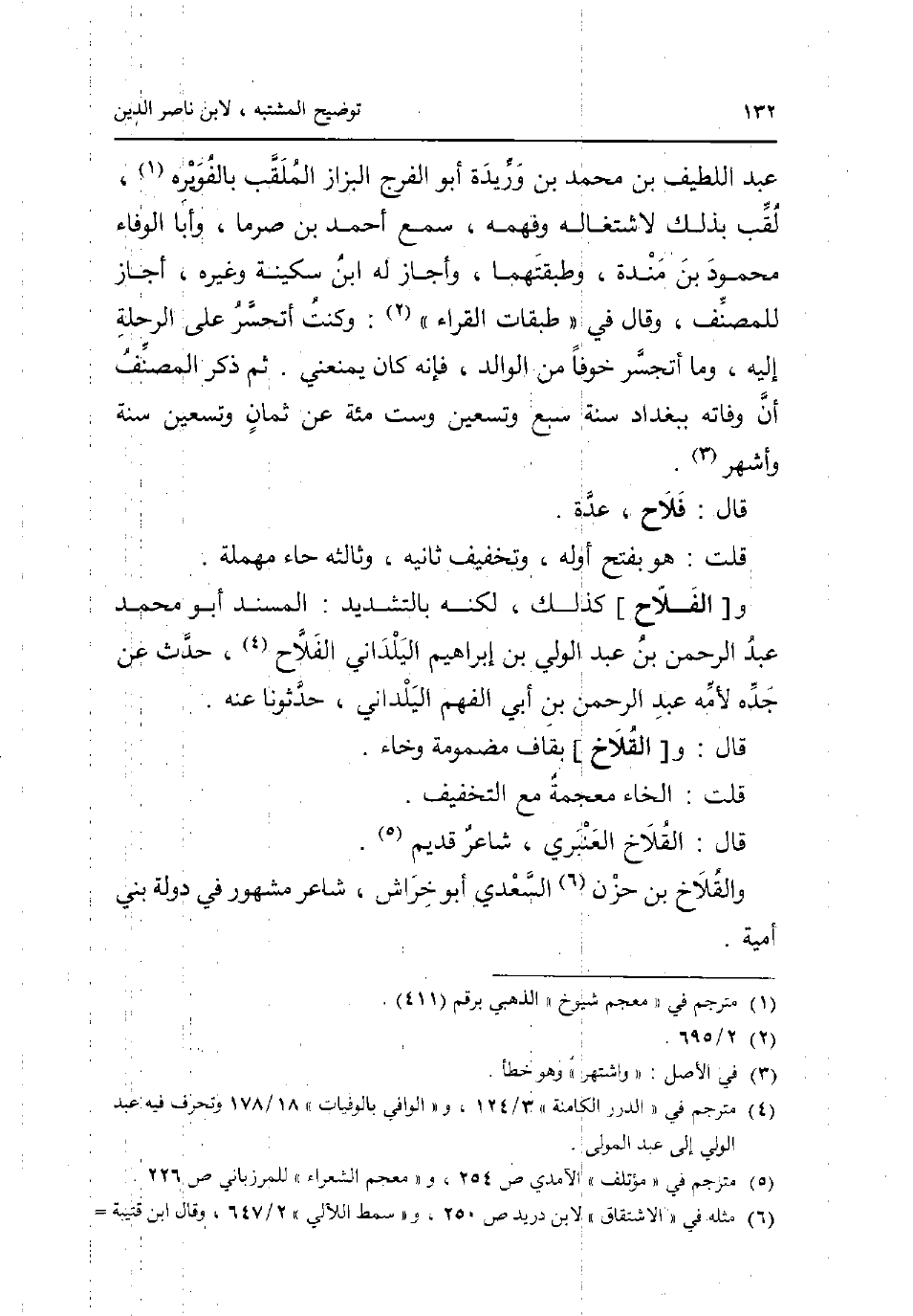 عبد اللَّطِيف بن مُحَمَّد بن وريدة أَبُو الْفرج الْبَزَّاز الملقب بالفويره لقب بذلك لاشتغاله وفهمه سمع أَحْمد بن صرما وَأَبا الْوَفَاء مَحْمُود بن مندة وطبقتهما وَأَجَازَ لَهُ ابْن سكينَة وَغَيره أجَاز للْمُصَنف وَقَالَ فِي طَبَقَات الْقُرَّاء: وَكنت أتحسر على الرحلة إِلَيْهِ وَمَا أتجسر خوفًا من الْوَالِد فَإِنَّهُ كَانَ يَمْنعنِي. ثمَّ ذكر المُصَنّف أَن وَفَاته بِبَغْدَاد سنة سبع وَتِسْعين وست مئة عَن ثَمَان وَتِسْعين سنة وَأشهر. قَالَ: فلاح عدَّة. قلت: هُوَ بِفَتْح أَوله وَتَخْفِيف ثَانِيه وثالثه حاء مُهْملَة. و [الْفَلاح] كَذَلِك لكنه بِالتَّشْدِيدِ: الْمسند أَبُو مُحَمَّد عبد الرَّحْمَن بن عبد الْوَلِيّ بن إِبْرَاهِيم اليلداني الْفَلاح حدث عَن جده لأمه عبد الرَّحْمَن بن أبي الْفَهم اليلداني حدثونا عَنهُ. قَالَ: و [القلاخ] بقاف مَضْمُومَة وخاء. قلت: الْخَاء مُعْجمَة مَعَ التَّخْفِيف. قَالَ: القلاخ الْعَنْبَري شَاعِر قديم. والقلاخ بن حزن السَّعْدِيّ أَبُو خرَاش شَاعِر مَشْهُور فِي دولة بني أُميَّة.