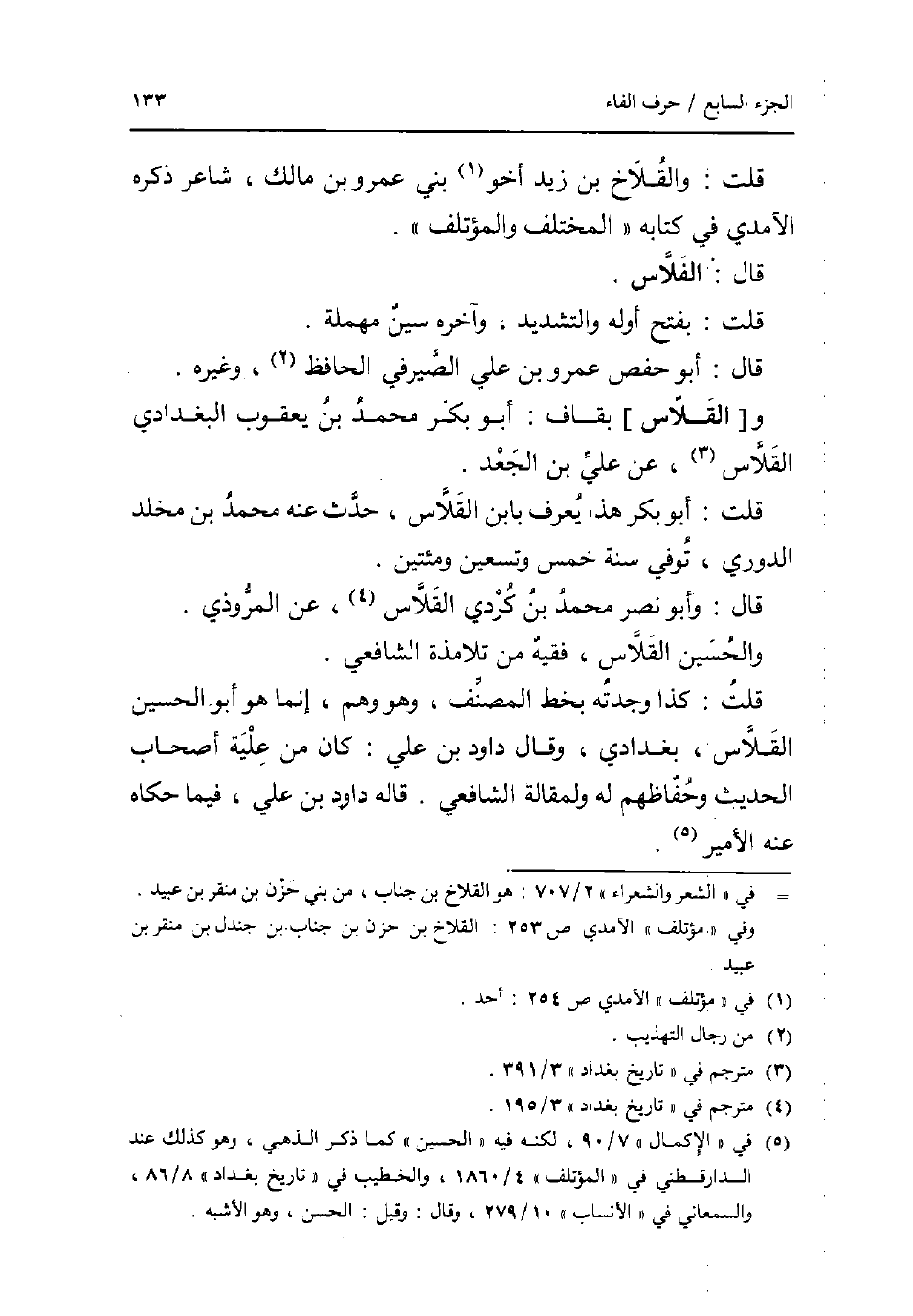 قلتك والقلاخ بن زيد أَخُو بني عَمْرو بن مَالك شَاعِر ذكره الْآمِدِيّ فِي كِتَابه الْمُخْتَلف والمؤتلف. قَالَ: الفلاس. قلت: بِفَتْح أَوله وَالتَّشْدِيد وَآخره سين مُهْملَة. قَالَ: أَبُو حَفْص عَمْرو بن عَليّ الصَّيْرَفِي الْحَافِظ وَغَيره. و [القلاس] بقاف: أَبُو بكر مُحَمَّد بن يَعْقُوب الْبَغْدَادِيّ القلاس عَن عَليّ بن الْجَعْد. قلت: أَبُو بكر هَذَا يعرف بِابْن القلاس حدث عَنهُ مُحَمَّد بن مخلد الدوري توفّي سنة خمس وَتِسْعين ومئتين. قَالَ: وَأَبُو نصر مُحَمَّد بن كردِي القلاس عَن الْمَرْوذِيّ. وَالْحُسَيْن القلاس فَقِيه من تلامذة الشَّافِعِي. قلت: كَذَا وجدته بِخَط المُصَنّف وَهُوَ وهم إِنَّمَا هُوَ أَبُو الْحُسَيْن القلاس بغدادي وَقَالَ دَاوُد بن عَليّ: كَانَ من علية أَصْحَاب الحَدِيث وحفاظهم لَهُ ولمقالة الشَّافِعِي. قَالَه دَاوُد بن عَليّ فِيمَا حَكَاهُ عَنهُ الْأَمِير.
