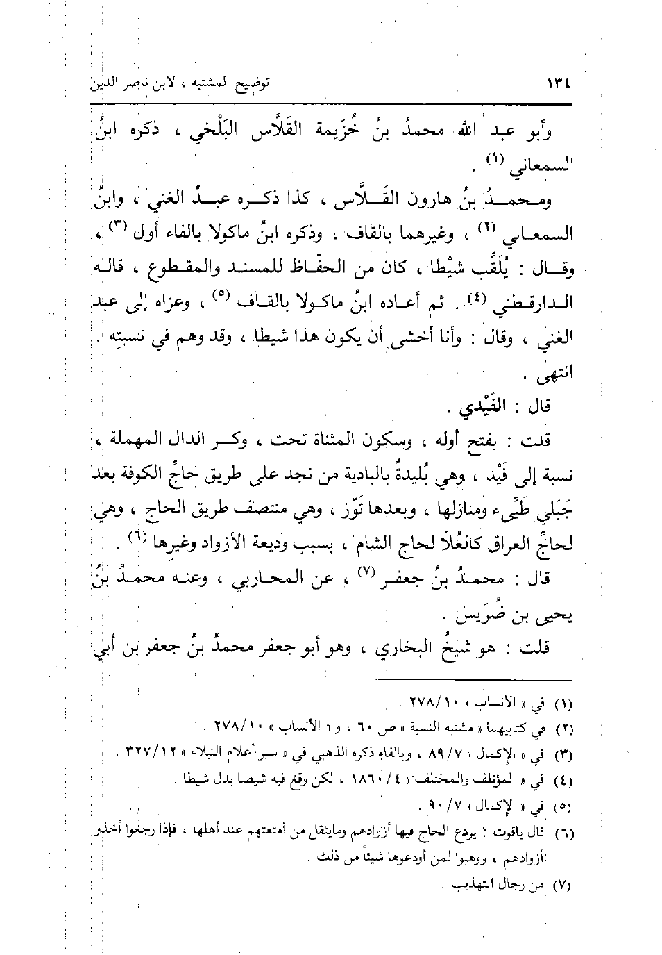 وَأَبُو عبد الله مُحَمَّد بن خُزَيْمَة القلاس الْبَلْخِي ذكره ابْن السَّمْعَانِيّ. وَمُحَمّد بن هَارُون القلاس كَذَا ذكره عبد الْغَنِيّ وَابْن السَّمْعَانِيّ وَغَيرهمَا بِالْقَافِ وَذكره ابْن مَاكُولَا بِالْفَاءِ أول وَقَالَ: يلقب شيطا كَانَ من الْحفاظ للمسند والمقطوع قَالَه الدَّارَقُطْنِيّ. ثمَّ أَعَادَهُ ابْن مَاكُولَا بِالْقَافِ وَعَزاهُ إِلَى عبد الْغَنِيّ وَقَالَ: وَأَنا أخْشَى أَن يكون هَذَا شيطا وَقد وهم فِي نسبته. انْتهى. قَالَ: الفيدي. قلت: بِفَتْح أَوله وَسُكُون الْمُثَنَّاة تَحت وَكسر الدَّال الْمُهْملَة نِسْبَة إِلَى فيد وَهِي بليدَة بالبادية من نجد على طَرِيق حَاج الْكُوفَة بعد جبلي طَيئ ومنازلها وَبعدهَا توز وَهِي منتصف طَرِيق الْحَاج وَهِي لحاج الْعرَاق كالعلا لحاج الشَّام بِسَبَب وَدِيعَة الأزواد وَغَيرهَا. قَالَ: مُحَمَّد بن جَعْفَر عَن الْمحَاربي وَعنهُ مُحَمَّد بن يحيى بن ضريس. قلت: هُوَ شيخ البُخَارِيّ وَهُوَ أَبُو جَعْفَر مُحَمَّد بن جَعْفَر بن أبي