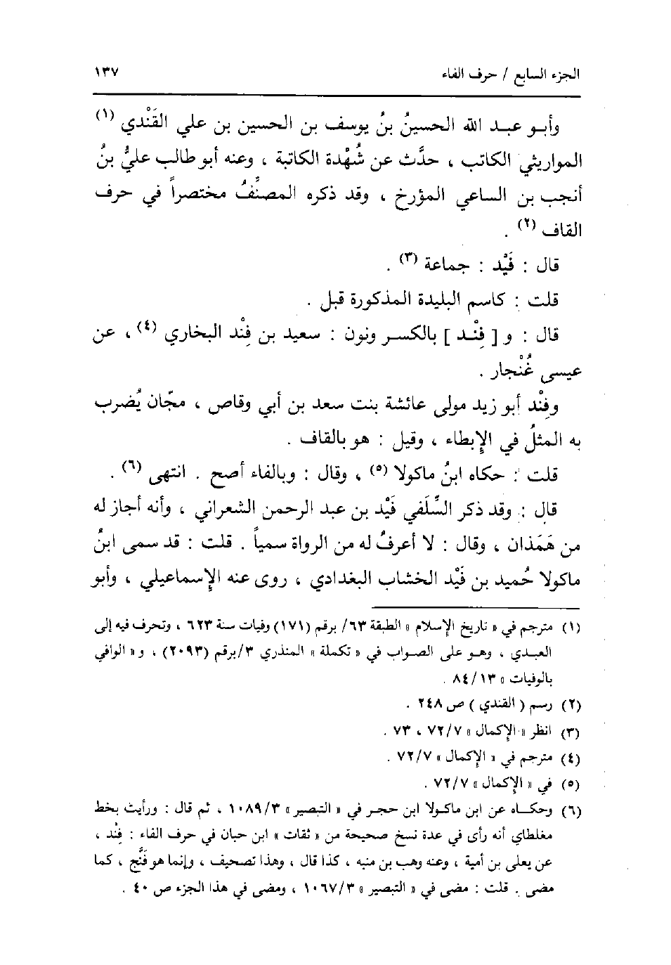 وَأَبُو عبد الله الْحُسَيْن بن يُوسُف بن الْحُسَيْن بن عَليّ القندي المواريثي الْكَاتِب حدث عَن شهدة الكاتبة وَعنهُ أَبُو طَالب عَليّ بن أَنْجَب بن السَّاعِي المؤرخ وَقد ذكره المُصَنّف مُخْتَصرا فِي حرف الْقَاف. قَالَ: فيد: جمَاعَة. قلت: كاسم البليدة الْمَذْكُورَة قبل. قَالَ: و [فند] بِالْكَسْرِ وَنون: سعيد بن فند البُخَارِيّ عَن عِيسَى غُنْجَار. وفند أَبُو زيد مولى عَائِشَة بنت سعد بن أبي وَقاص مجان يضْرب بِهِ الْمثل فِي الإبطاء وَقيل: هُوَ بِالْقَافِ. قلت: حَكَاهُ ابْن مَاكُولَا وَقَالَ: وبالفاء أصح. انْتهى. قَالَ: وَقد ذكر السلَفِي فيد بن عبد الرَّحْمَن الشعراني وَأَنه أجَاز لَهُ من همذان وَقَالَ: لَا أعرف لَهُ من الروَاة سميا. قلت: قد سمى ابْن مَاكُولَا حميد بن فيد الخشاب الْبَغْدَادِيّ روى عَنهُ الْإِسْمَاعِيلِيّ وَأَبُو