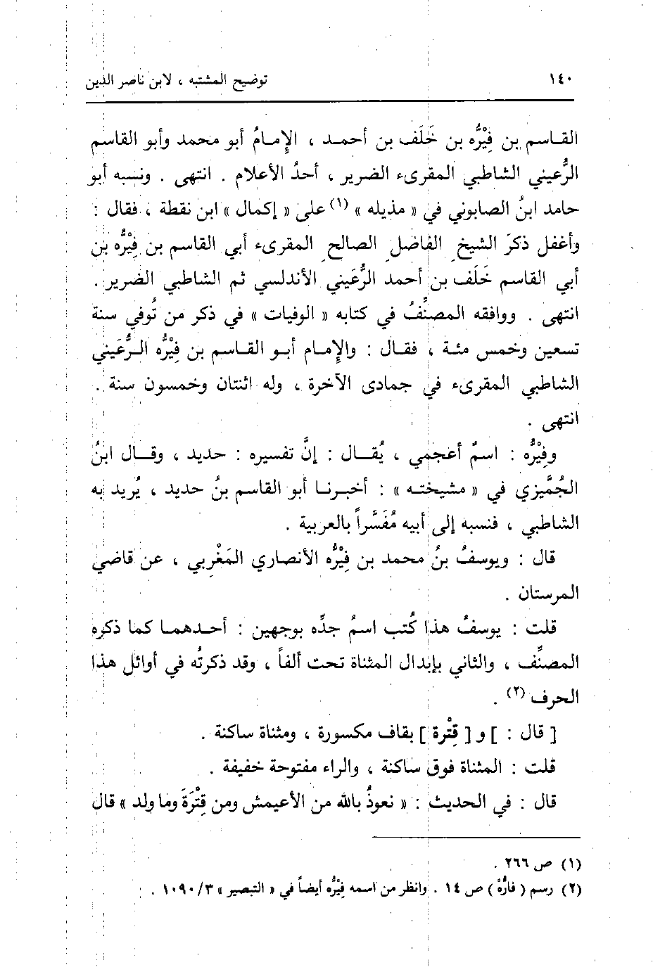 الْقَاسِم بن فيره بن خلف بن أَحْمد الإِمَام أَبُو مُحَمَّد وَأَبُو الْقَاسِم الرعيني الشاطبي الْمُقْرِئ الضَّرِير أحد الْأَعْلَام. انْتهى. وَنسبه أَبُو حَامِد ابْن الصَّابُونِي فِي مذيله على إِكْمَال ابْن نقطة فَقَالَ: وأغفل ذكر الشَّيْخ الْفَاضِل الصَّالح الْمُقْرِئ أبي الْقَاسِم بن فيره بن أبي الْقَاسِم خلف بن أَحْمد الرعيني الأندلسي ثمَّ الشاطبي الضَّرِير. انْتهى. وَوَافَقَهُ المُصَنّف فِي كِتَابه الوفيات فِي ذكر من توفّي سنة تسعين وَخمْس مئة فَقَالَ: وَالْإِمَام أَبُو الْقَاسِم بن فيره الرعيني الشاطبي الْمُقْرِئ فِي جُمَادَى الْآخِرَة وَله اثْنَتَانِ وَخَمْسُونَ سنة. انْتهى. وفيره: اسْم أعجمي يُقَال: إِن تَفْسِيره: حَدِيد وَقَالَ ابْن الجميزي فِي مشيخته: أخبرنَا أَبُو الْقَاسِم بن حَدِيد يُرِيد بِهِ الشاطبي فنسبه إِلَى أَبِيه مُفَسرًا بِالْعَرَبِيَّةِ. قَالَ: ويوسف بن مُحَمَّد بن فيره الْأنْصَارِيّ المغربي عَن قَاضِي المرستان. قلت: يُوسُف هَذَا كتب اسْم جده بِوَجْهَيْنِ: أَحدهمَا كَمَا ذكره المُصَنّف وَالثَّانِي بإبدال الْمُثَنَّاة تَحت ألفا وَقد ذكرته فِي أَوَائِل هَذَا الْحَرْف. [قَالَ:] و [قترة] بقاف مَكْسُورَة ومثناة سَاكِنة. قلت: الْمُثَنَّاة فَوق سَاكِنة وَالرَّاء مَفْتُوحَة خَفِيفَة. قَالَ: فِي الحَدِيث: نَعُوذ بِاللَّه من الأعيمش وَمن قترة وَمَا ولد قَالَ