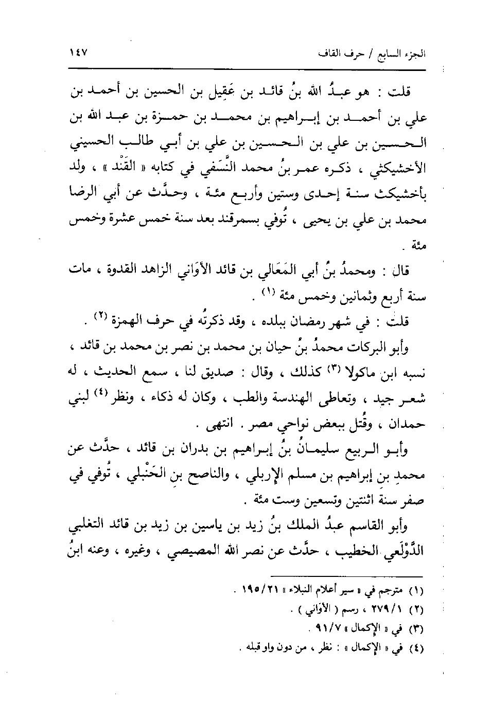 قلت: هُوَ عبد الله بن قَائِد بن عقيل بن الْحُسَيْن بن أَحْمد بن عَليّ بن أَحْمد بن إِبْرَاهِيم بن مُحَمَّد بن حَمْزَة بن عبد الله بن الْحُسَيْن بن عَليّ بن الْحُسَيْن بن عَليّ بن أبي طَالب الْحُسَيْنِي الأخشيكثي ذكره عمر بن مُحَمَّد النَّسَفِيّ فِي كِتَابه القند ولد بأخشيكث سنة إِحْدَى وَسِتِّينَ وَأَرْبع مئة وَحدث عَن أبي الرِّضَا مُحَمَّد بن عَليّ بن يحيى توفّي بسمرقند بعد سنة خمس عشرَة وَخمْس مئة. قَالَ: وَمُحَمّد بن أبي الْمَعَالِي بن قَائِد الْأَوَانِي الزَّاهِد الْقدْوَة مَاتَ سنة أَربع وَثَمَانِينَ وَخمْس مئة. قلت: فِي شهر رَمَضَان بِبَلَدِهِ وَقد ذكرته فِي حرف الْهمزَة. وَأَبُو البركات مُحَمَّد بن حَيَّان بن مُحَمَّد بن نصر بن مُحَمَّد بن قَائِد نسبه ابْن مَاكُولَا كَذَلِك وَقَالَ: صديق لنا سمع الحَدِيث لَهُ شعر جيد وتعاطى الهندسة والطب وَكَانَ لَهُ ذكاء وَنظر لبني حمدَان وَقتل بِبَعْض نواحي مصر. انْتهى. وَأَبُو الرّبيع سُلَيْمَان بن إِبْرَاهِيم بن بدران بن قَائِد حدث عَن مُحَمَّد بن إِبْرَاهِيم بن مُسلم الإربلي والناصح بن الْحَنْبَلِيّ توفّي فِي صفر سنة اثْنَتَيْنِ وَتِسْعين وست مئة. وَأَبُو الْقَاسِم عبد الْملك بن زيد بن ياسين بن زيد بن قَائِد التغلبي الدولعي الْخَطِيب حدث عَن نصر الله المصِّيصِي وَغَيره وَعنهُ ابْن