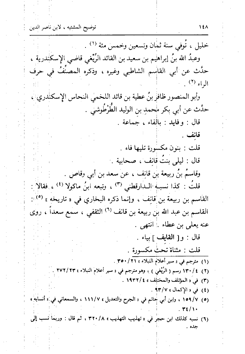 خَلِيل توفّي سنة ثَمَان وَتِسْعين وَخمْس مئة. وَعبد الله بن إِبْرَاهِيم بن سعيد بن الْقَائِد الريغي قَاضِي الْإسْكَنْدَريَّة حدث عَن أبي الْقَاسِم الشاطبي وَغَيره وَذكره المُصَنّف فِي حرف الرَّاء. وَأَبُو الْمَنْصُور ظافر بن عَطِيَّة بن قَائِد اللَّخْمِيّ النّحاس الإسكندري حدث عَن أبي بكر مُحَمَّد بن الْوَلِيد الطرطوشي. قَالَ: وفايد: بِالْفَاءِ جمَاعَة. قانف. قلت: بنُون مَكْسُورَة تَلِيهَا فَاء. قَالَ: ليلى بنت قانف صحابية. وقاسم بن ربيعَة بن قانف عَن سعد بن أبي وَقاص. قلت: كَذَا نسبه الدَّارَقُطْنِيّ وَتَبعهُ ابْن مَاكُولَا فَقَالَا: الْقَاسِم بن ربيعَة بن قانف وَإِنَّمَا ذكره البُخَارِيّ فِي تَارِيخه: الْقَاسِم بن عبد الله بن ربيعَة بن قانف الثَّقَفِيّ سمع سَعْدا روى عَنهُ يعلى بن عَطاء. انْتهى. قَالَ: و [القايف] بياء. قلت: مثناة تَحت مَكْسُورَة.