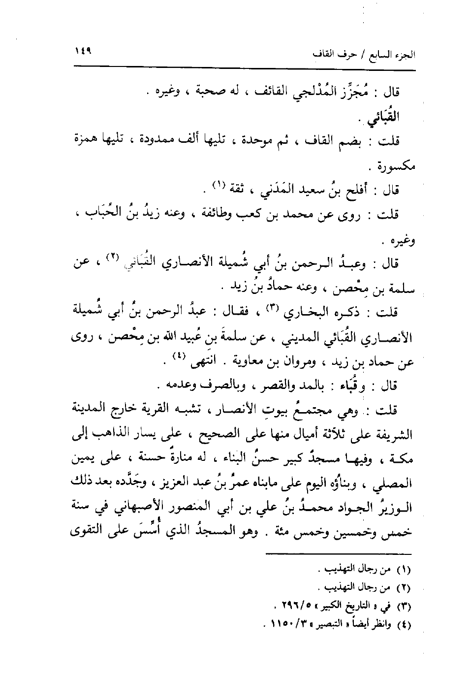 قَالَ: مجزز المدلجي الْقَائِف لَهُ صُحْبَة وَغَيره. القبائي. قلت: بِضَم الْقَاف ثمَّ مُوَحدَة تَلِيهَا ألف ممدودة تَلِيهَا همزَة مَكْسُورَة. قَالَ: أَفْلح بن سعيد الْمدنِي ثِقَة. قلت: روى عَن مُحَمَّد بن كَعْب وَطَائِفَة وَعنهُ زيد بن الْحباب وَغَيره. قَالَ: وَعبد الرَّحْمَن بن أبي شميلة الْأنْصَارِيّ القبائي عَن سَلمَة بن مُحصن وَعنهُ حَمَّاد بن زيد. قلت: ذكره البُخَارِيّ فَقَالَ: عبد الرَّحْمَن بن أبي شميلة الْأنْصَارِيّ القبائي الْمَدِينِيّ عَن سَلمَة بن عبيد الله بن مُحصن روى عَن حَمَّاد بن زيد ومروان بن مُعَاوِيَة. انْتهى. قَالَ: وقباء: بِالْمدِّ وَالْقصر وبالصرف وَعَدَمه. قلت: وَهِي مُجْتَمع بيُوت الْأَنْصَار تشبه الْقرْيَة خَارج الْمَدِينَة الشَّرِيفَة على ثَلَاثَة أَمْيَال مِنْهَا على الصَّحِيح على يسَار الذَّاهِب إِلَى مَكَّة وفيهَا مَسْجِد كَبِير حسن الْبناء لَهُ منازة حَسَنَة على يَمِين الْمُصَلِّي وبناؤه الْيَوْم على مَا بناه عمر بن عبد الْعَزِيز وجدده بعد ذَلِك الْوَزير الْجواد مُحَمَّد بن عَليّ بن أبي الْمَنْصُور الْأَصْبَهَانِيّ فِي سنة خمس وَخمسين وَخمْس مئة. وَهُوَ الْمَسْجِد الَّذِي أسس على التَّقْوَى.