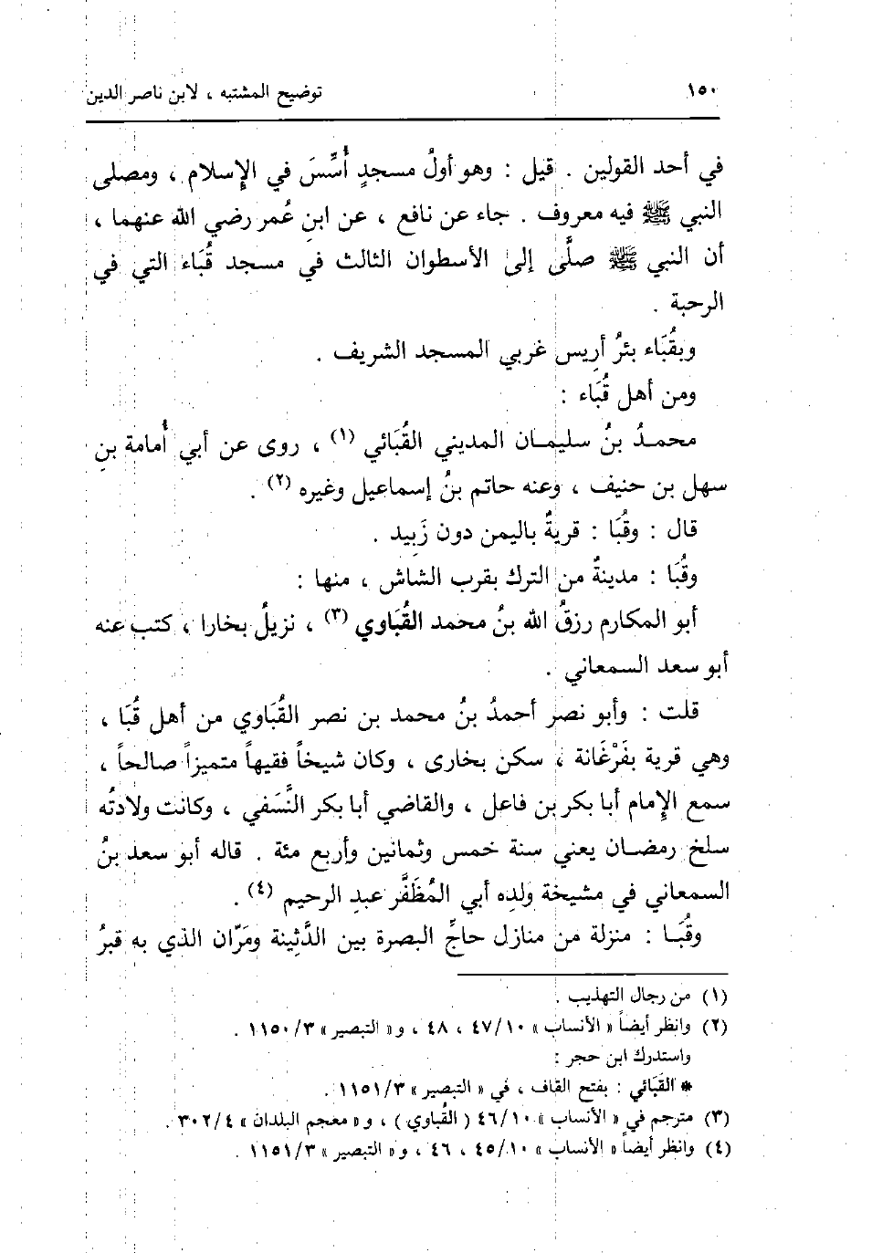 فِي أحد الْقَوْلَيْنِ: قيل: وَهُوَ أول مَسْجِد أسس فِي الْإِسْلَام ومصلى النَّبِي صلى الله عَلَيْهِ وَسلم فِيهِ مَعْرُوف. جَاءَ عَن نَافِع عَن ابْن عمر رَضِي الله عَنْهُمَا أَن النَّبِي صلى الله عَلَيْهِ وَسلم صلى إِلَى الأسطوان الثَّالِث فِي مَسْجِد قبَاء الَّتِي فِي الرحبة. وبقباء بِئْر أريس غربي الْمَسْجِد الشريف. وَمن أهل قبَاء: مُحَمَّد بن سُلَيْمَان الْمَدِينِيّ القبائي روى عَن أبي أُمَامَة بن سهل بن حنيف وَعنهُ حَاتِم بن إِسْمَاعِيل وَغَيره. قَالَ: وقبا: قَرْيَة بِالْيمن دون زبيد. وقبا: مَدِينَة من التّرْك بِقرب الشاش مِنْهَا: أَبُو المكارم رزق الله بن مُحَمَّد القباوي نزيل بخارا كتب عَنهُ أَبُو سعد السَّمْعَانِيّ. قلت: وَأَبُو نصر أَحْمد بن مُحَمَّد بن نصر القباوي من أهل قبا وَهِي قَرْيَة بفرغانة سكن بُخَارى وَكَانَ شَيخا فَقِيها متميزا صَالحا سمع الإِمَام أَبَا بكر بن فَاعل وَالْقَاضِي أَبَا بكر النَّسَفِيّ وَكَانَت وِلَادَته سلخ رَمَضَان يَعْنِي سنة خمس وَثَمَانِينَ وَأَرْبع مئة. قَالَه أَبُو سعد بن السَّمْعَانِيّ فِي مشيخة وَلَده أبي المظفر عبد الرَّحِيم. وقبا: منزلَة من منَازِل حَاج الْبَصْرَة بَين الدثينة ومران الَّذِي بِهِ قبر