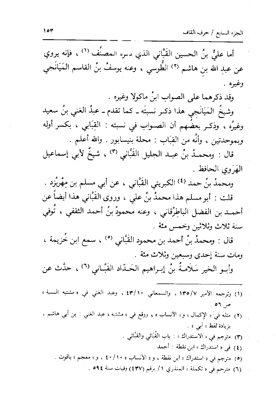 أما عَليّ بن الْحُسَيْن القباني الَّذِي ذكره المُصَنّف فَإِنَّهُ يروي عَن عبد الله بن هَاشم الطوسي وَعنهُ يُوسُف بن الْقَاسِم الميانجي وَغَيره. وَقد ذكرهمَا على الصَّوَاب ابْن مَاكُولَا وَغَيره. وَشَيخ الميانجي هَذَا ذكر نسبته - كَمَا تقدم - عبد الْغَنِيّ بن سعيد وَغَيره وَذكر بَعضهم أَن الصَّوَاب فِي نسبته: القبابي بِكَسْر أَوله وبموحدتين وَأَنه من القباب: محلّة بنيسابور. وَالله أعلم. قَالَ: وَمُحَمّد بن عبد الْجَلِيل القباني شيخ لأبي إِسْمَاعِيل الْهَرَوِيّ الْحَافِظ. وَمُحَمّد بن حمد الكبريتي القباني عَن أبي مُسلم بن مهربزد. قلت: أَبُو مُسلم هَذَا مُحَمَّد بن عَليّ وروى القباني هَذَا أَيْضا عَن أَحْمد بن الْفضل الْبَاطِرْقَانِيُّ وَعنهُ مَحْمُود بن أَحْمد الثَّقَفِيّ توفّي سنة ثَلَاث وَثَلَاثِينَ وَخمْس مئة. قَالَ: وَمُحَمّد بن أَحْمد بن مَحْمُود القباني سمع ابْن خُزَيْمَة وَمَات سنة إِحْدَى وَسبعين وَثَلَاث مئة. وَأَبُو الْخَيْر سَلامَة بن إِبْرَاهِيم الْحداد القباني حدث عَن