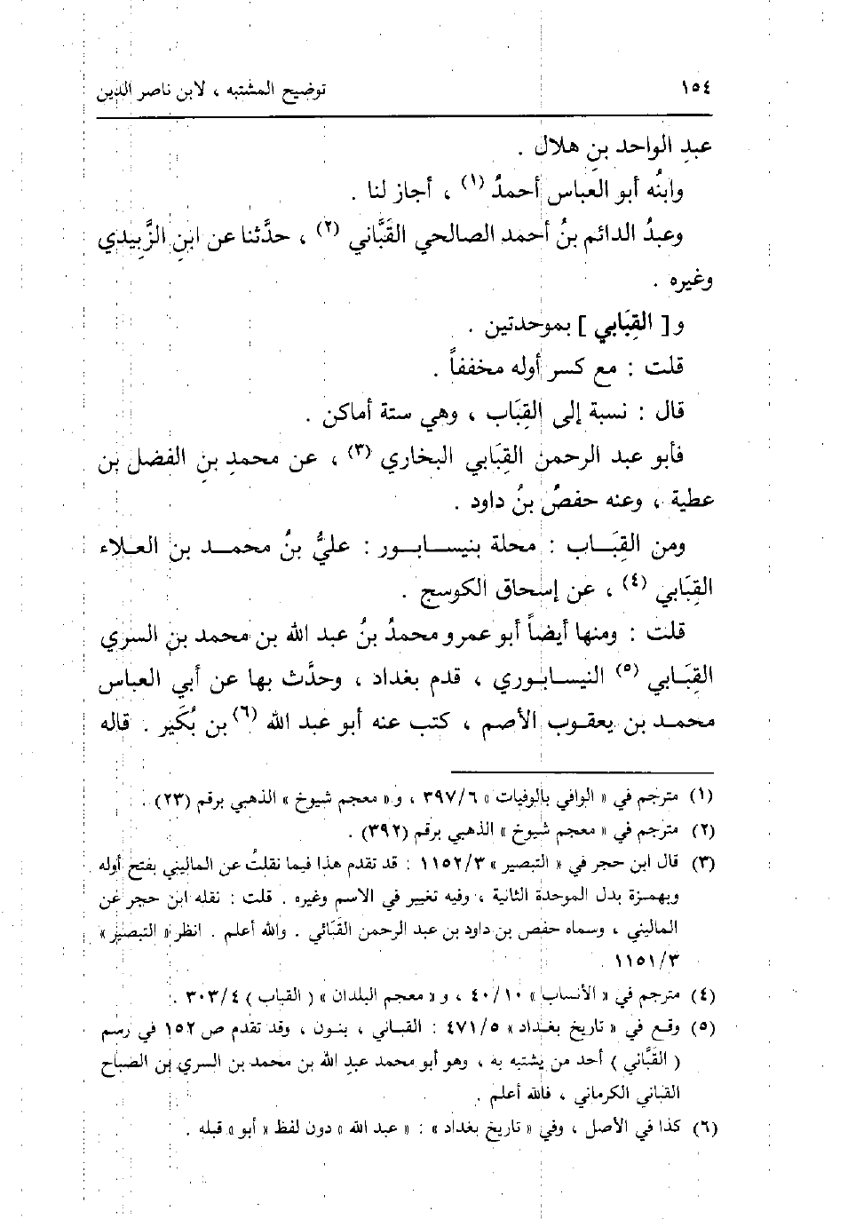 عبد الْوَاحِد بن هِلَال. وَابْنه أَبُو الْعَبَّاس أَحْمد أجَاز لنا. وَعبد الدَّائِم بن أَحْمد الصَّالِحِي القباني حَدثنَا عَن ابْن الزبيدِيّ وَغَيره. و [القبابي] بموحدتين. قلت: مَعَ كسر أَوله مخففا. قَالَ: نِسْبَة إِلَى القباب وَهِي سِتَّة أَمَاكِن. فَأَبُو عبد الرَّحْمَن القبابي البُخَارِيّ عَن مُحَمَّد بن الْفضل بن عَطِيَّة وَعنهُ حَفْص بن دَاوُد. وَمن القباب: محلّة بنيسابور: عَليّ بن مُحَمَّد بن الْعَلَاء القبابي عَن إِسْحَاق الكوسج. قلت: وَمِنْهَا أَيْضا أَبُو عَمْرو مُحَمَّد بن عبد الله بن مُحَمَّد بن السّري القبابي النَّيْسَابُورِي قدم بَغْدَاد وَحدث بهَا عَن أبي الْعَبَّاس مُحَمَّد بن يَعْقُوب الْأَصَم كتب عَنهُ أَبُو عبد الله بن بكير. قَالَه