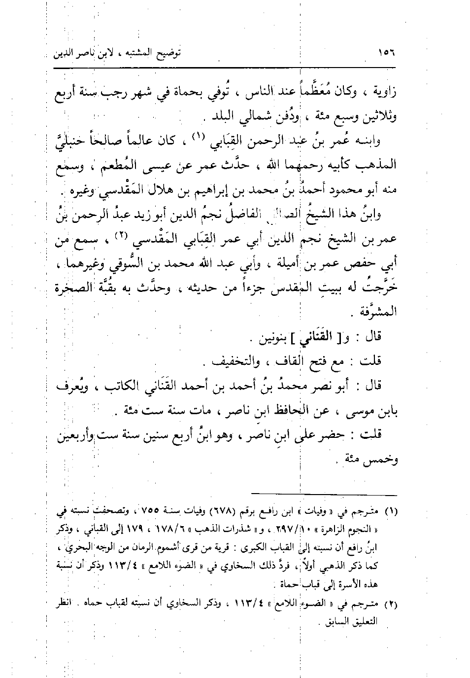 زَاوِيَة وَكَانَ مُعظما عِنْد النَّاس توفّي بحماة فِي شهر رَجَب سنة أَربع وَثَلَاثِينَ وَسبع مئة وَدفن شمَالي الْبَلَد. وَابْنه عمر بن عبد الرَّحْمَن القبابي كَانَ عَالما صَالحا حنبلي الْمَذْهَب كأبيه رحمهمَا الله حدث عمر عَن عِيسَى الْمطعم وَسمع مِنْهُ أَبُو مَحْمُود أَحْمد بن مُحَمَّد بن إِبْرَاهِيم بن هِلَال الْمَقْدِسِي وَغَيره. وَابْن هَذَا الشَّيْخ الصَّالح الْفَاضِل نجم الدّين أَبُو زيد عبد الرَّحْمَن بن عمر بن الشَّيْخ نجم الدّين أبي عمر القبابي الْمَقْدِسِي سمع من أبي حَفْص عمر بن أميلة وَأبي عبد الله مُحَمَّد بن السوقي وَغَيرهمَا خرجت لَهُ بِبَيْت الْمُقَدّس جُزْءا من حَدِيثه وَحدث بِهِ بقبة الصَّخْرَة المشرفة. قَالَ: و [القناني] بنونين. قلت: مَعَ فتح الْقَاف وَالتَّخْفِيف. قَالَ: أَبُو نصر مُحَمَّد بن أَحْمد بن أَحْمد القناني الْكَاتِب وَيعرف بِابْن مُوسَى عَن الْحَافِظ ابْن نَاصِر مَاتَ سنة سِتّ مئة. قلت: حضر على ابْن نَاصِر وَهُوَ ابْن أَربع سِنِين سنة سِتّ وَأَرْبَعين وَخمْس مئة.