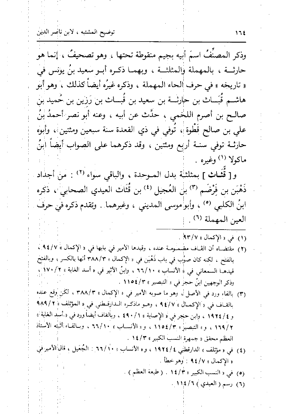 وَذكر المُصَنّف اسْم أَبِيه بجيم منقوطة تحتهَا وَهُوَ تَصْحِيف إِنَّمَا هُوَ حَارِثَة بِالْمُهْمَلَةِ والمثلثة وَبِهِمَا ذكره أَبُو سعيد بن يُونُس فِي تَارِيخه فِي حرف الْحَاء الْمُهْملَة وَذكره غَيره أَيْضا كَذَلِك وَهُوَ أَبُو هَاشم قباث بن حَارِثَة بن سعيد بن قباث بن رزين بن حميد بن صَالح بن أَصْرَم اللَّخْمِيّ حدث عَن أَبِيه وَعنهُ أَبُو نصر أَحْمد بن عَليّ بن صَالح قطوة توفّي فِي ذِي الْقعدَة سنة سبعين ومئتين وَأَبوهُ حَارِثَة توفّي سنة أَربع ومئتين وَقد ذكرهمَا على الصَّوَاب أَيْضا ابْن مَاكُولَا وَغَيره. و [قثاث] بمثلثة بدل الْمُوَحدَة وَالْبَاقِي سَوَاء: من أجداد ذهبن بن فرضم بن العجيل بن قثاث العيدي الصَّحَابِيّ ذكره ابْن الْكَلْبِيّ وَأَبُو مُوسَى الْمَدِينِيّ وَغَيرهمَا. وَتقدم ذكره فِي حرف الْعين الْمُهْملَة.