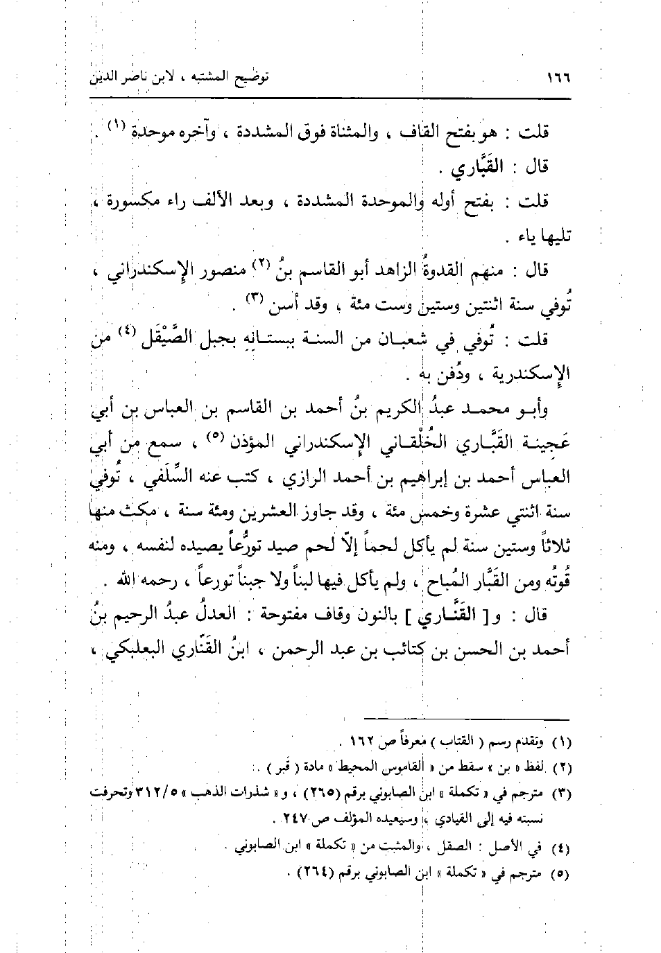 قلت: هُوَ بِفَتْح الْقَاف والمثناة فَوق الْمُشَدّدَة وَآخره مُوَحدَة. قَالَ: القباري. قلت: بِفَتْح أَوله وَالْمُوَحَّدَة الْمُشَدّدَة وَبعد الْألف رَاء مَكْسُورَة تَلِيهَا يَاء. قَالَ: مِنْهُم الْقدْوَة الزَّاهِد أَبُو الْقَاسِم بن مَنْصُور الإسْكَنْدراني توفّي سنة اثْنَتَيْنِ وَسِتِّينَ وست مئة وَقد أسن. قلت: توفّي فِي شعْبَان من السّنة ببستانه بجبل الصيقل من الْإسْكَنْدَريَّة وَدفن بِهِ. وَأَبُو مُحَمَّد عبد الْكَرِيم بن أَحْمد بن الْقَاسِم بن الْعَبَّاس بن أبي عجينة القباري الخلقاني الإسْكَنْدراني الْمُؤَذّن سمع من أبي الْعَبَّاس أَحْمد بن إِبْرَاهِيم بن أَحْمد الرَّازِيّ كتب عَنهُ السلَفِي توفّي سنة اثْنَتَيْ عشرَة وَخمْس مئة وَقد جَاوز الْعشْرين ومئة سنة مكث مِنْهَا ثَلَاثًا وَسِتِّينَ سنة لم يَأْكُل لَحْمًا إِلَّا لحم صيد تورعا يصيده لنَفسِهِ وَمِنْه قوته وَمن القبار الْمُبَاح وَلم يَأْكُل فِيهَا لَبَنًا وَلَا جبنا تورعا رَحمَه الله. قَالَ: و [القناري] بالنُّون وقاف مَفْتُوحَة: الْعدْل عبد الرَّحِيم بن أَحْمد بن الْحسن بن كتائب بن عبد الرَّحْمَن ابْن القناري البعلبكي