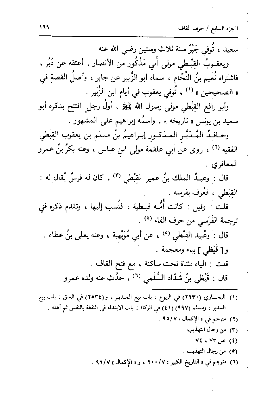 سعيد توفّي جبر سنة ثَلَاث وَسِتِّينَ رَضِي الله عَنهُ. وَيَعْقُوب القبطي مولى أبي مَذْكُور من الْأَنْصَار أعْتقهُ عَن دبر فَاشْتَرَاهُ نعيم بن النحام سَمَّاهُ أَبُو الزبير عَن جَابر وأصل الْقِصَّة فِي الصَّحِيحَيْنِ توفّي يَعْقُوب فِي أَيَّام ابْن الزبير. وَأَبُو رَافع القبطي مولى رَسُول الله صلى الله عَلَيْهِ وَسلم أول رجل افْتتح بِذكرِهِ أَبُو سعيد بن يُونُس تَارِيخه واسْمه إِبْرَاهِيم على الْمَشْهُور. وحافد الْمُدبر الْمَذْكُور إِبْرَاهِيم بن مُسلم بن يَعْقُوب القبطي الْفَقِيه روى عَن أبي عَلْقَمَة مولى ابْن عَبَّاس وَعنهُ بكر بن عَمْرو الْمعَافِرِي. قَالَ: وَعبد الْملك بن عُمَيْر القبطي كَانَ لَهُ فرس يُقَال لَهُ: القبطي فَعرف بفرسه. قلت: وَقيل: كَانَت أمه قبطية فنسب إِلَيْهَا وَتقدم ذكره فِي تَرْجَمَة الفرسي من حرف الْفَاء. قَالَ: وَعبيد القبطي عَن أبي مويهبة وَعنهُ يعلى بن عَطاء. و [قيظي] بياء ومعجمة. قلت: الْيَاء مثناة تَحت سَاكِنة مَعَ فتح الْقَاف. قَالَ: قيظي بن شَدَّاد السّلمِيّ حدث عَنهُ وَلَده عَمْرو.