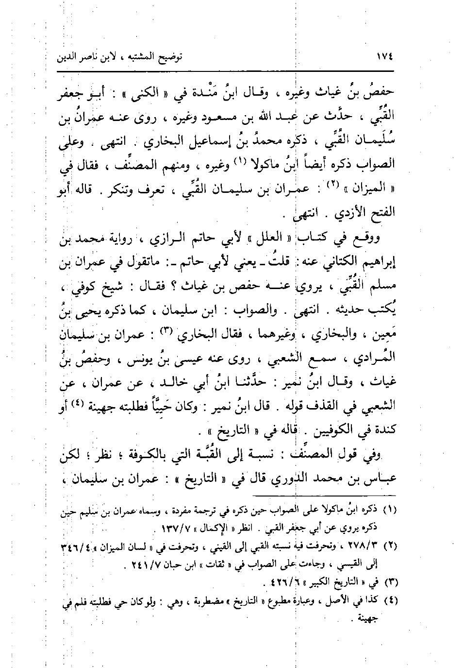 حَفْص بن غياث وَغَيره وَقَالَ ابْن مندة فِي الكنى: أَبُو جَعْفَر القبي حدث عَن عبد الله بن مَسْعُود وَغَيره روى عَنهُ عمرَان بن سُلَيْمَان القبي ذكره مُحَمَّد بن إِسْمَاعِيل البُخَارِيّ. انْتهى. وعَلى الصَّوَاب ذكره أَيْضا ابْن مَاكُولَا وَغَيره وَمِنْهُم المُصَنّف فَقَالَ فِي الْمِيزَان: عمرَان بن سُلَيْمَان القبي تعرف وتنكر. قَالَه أَبُو الْفَتْح الْأَزْدِيّ. انْتهى. وَوَقع فِي كتاب الْعِلَل لأبي حَاتِم الرَّازِيّ رِوَايَة مُحَمَّد بن إِبْرَاهِيم الكتاني عَنهُ: قلت _ يَعْنِي لأبي حَاتِم _: مَا تَقول فِي عمرَان بن مُسلم القبي يروي عَنهُ حَفْص بن غياث؟ فَقَالَ: شيخ كُوفِي يكْتب حَدِيثه. انْتهى. وَالصَّوَاب: ابْن سُلَيْمَان كَمَا ذكره يحيى بن معِين وَالْبُخَارِيّ وَغَيرهمَا فَقَالَ البُخَارِيّ: عمرَان بن سُلَيْمَان الْمرَادِي سمع الشّعبِيّ روى عَنهُ عِيسَى بن يُونُس وَحَفْص بن غياث وَقَالَ ابْن نمير: حَدثنَا ابْن أبي خَالِد عَن عمرَان عَن الشّعبِيّ فِي الْقَذْف قَوْله. قَالَ ابْن نمير: وَكَانَ حييا فطلبته جُهَيْنَة أَو كِنْدَة فِي الْكُوفِيّين. قَالَه فِي التَّارِيخ. وَفِي قَول المُصَنّف: نِسْبَة إِلَى الْقبَّة الَّتِي بِالْكُوفَةِ؛ نظر؛ لَكِن عَبَّاس بن مُحَمَّد الدوري قَالَ فِي التَّارِيخ: عمرَان بن سُلَيْمَان