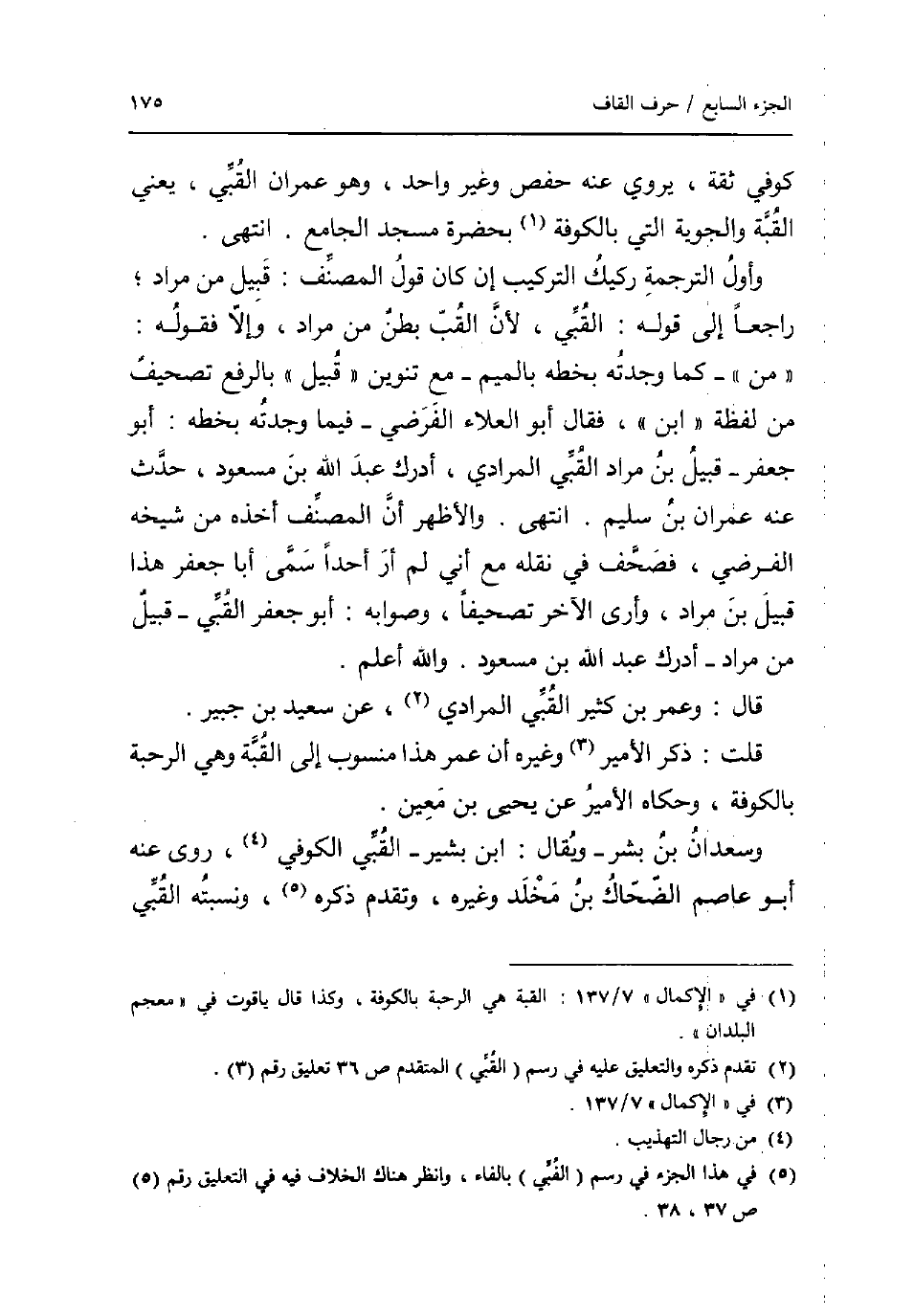 كُوفِي ثِقَة يروي عَنهُ حَفْص وَغير وَاحِد وَهُوَ عمرَان القبي يَعْنِي الْقبَّة والجوية الَّتِي بِالْكُوفَةِ بِحَضْرَة مَسْجِد الْجَامِع. انْتهى. وَأول التَّرْجَمَة رَكِيك التَّرْكِيب إِن كَانَ قَول المُصَنّف: قبيل من مُرَاد؛ رَاجعا إِلَى قَوْله: القبي لِأَن القب بطن من مُرَاد وَإِلَّا فَقَوله: من _ كَمَا وجدته بِخَطِّهِ بِالْمِيم _ مَعَ تَنْوِين قبيل بِالرَّفْع تَصْحِيف من لَفْظَة ابْن فَقَالَ أَبُو الْعَلَاء الفرضي _ فِيمَا وجدته بِخَطِّهِ: أَبُو جَعْفَر _ قبيل بن مُرَاد القبي الْمرَادِي أدْرك عبد الله بن مَسْعُود حدث عَنهُ عمرَان بن سليم. انْتهى. وَالْأَظْهَر أَن المُصَنّف أَخذه من شَيْخه الفرضي فصحف فِي نَقله مَعَ أَنِّي لم أر أحدا سمى أَبَا جَعْفَر هَذَا قبيل بن مُرَاد وَأرى الآخر تصحيفا وَصَوَابه: أَبُو جَعْفَر القبي _ قبيل من مُرَاد _ أدْرك عبد الله بن مَسْعُود. وَالله أعلم. قَالَ: وَعمر بن كثير القبي الْمرَادِي عَن سعيد بن جُبَير. قلت: ذكر الْأَمِير وَغَيره أَن عمر هَذَا مَنْسُوب إِلَى الْقبَّة وَهِي الرحبة بِالْكُوفَةِ وَحَكَاهُ الْأَمِير عَن يحيى بن معِين. وسعدان بن بشر _ وَيُقَال: ابْن بشير _ القبي الْكُوفِي روى عَنهُ أَبُو عَاصِم الضَّحَّاك بن مخلد وَغَيره وَتقدم ذكره ونسبته القبي