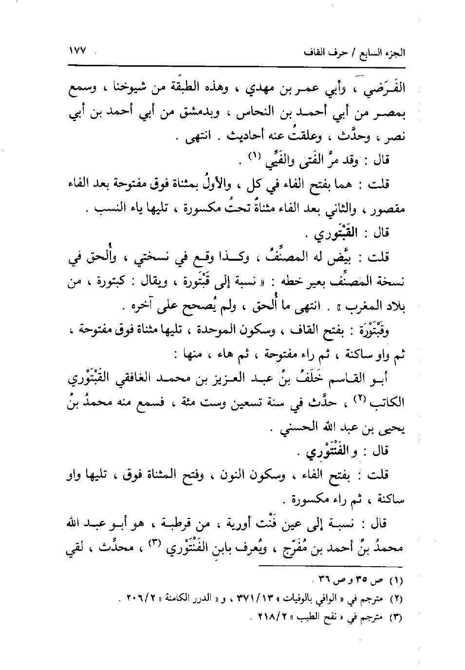 الفرضي وَأبي عمر بن مهْدي وَهَذِه الطَّبَقَة من شُيُوخنَا وَسمع بِمصْر من أبي أَحْمد بن النّحاس وبدمشق من أبي أَحْمد بن أبي نصر وَحدث وعلقت عَنهُ أَحَادِيث. انْتهى. قَالَ: وَقد مر الْفَتى والفيي. قلت: هما بِفَتْح الْفَاء فِي كل وَالْأول بمثناة فَوق مَفْتُوحَة بعد الْفَاء مَقْصُور وَالثَّانِي بعد الْفَاء مثناة تَحت مَكْسُورَة تَلِيهَا يَاء النّسَب. قَالَ: القبتوري. قلت: بيض لَهُ المُصَنّف وَكَذَا وَقع فِي نُسْخَتي وَألْحق فِي نُسْخَة المُصَنّف بِغَيْر خطه: نِسْبَة إِلَى قبتورة وَيُقَال: كبتورة من بِلَاد الْمغرب. انْتهى مَا ألحق وَلم يصحح على آخِره. وقبتورة: بِفَتْح الْقَاف وَسُكُون الْمُوَحدَة تَلِيهَا مثناة فَوق مَفْتُوحَة ثمَّ وَاو سَاكِنة ثمَّ رَاء مَفْتُوحَة ثمَّ هَاء مِنْهَا: أَبُو الْقَاسِم خلف بن عبد الْعَزِيز بن مُحَمَّد الغافقي القبتوري الْكَاتِب حدث فِي سنة تسعين وست مئة فَسمع مِنْهُ مُحَمَّد بن يحيى بن عبد الله الحسني. قَالَ: والفنتوري. قلت: بِفَتْح الْفَاء وَسُكُون النُّون وَفتح الْمُثَنَّاة فَوق تَلِيهَا وَاو سَاكِنة ثمَّ رَاء مَكْسُورَة. قَالَ: نِسْبَة إِلَى عين فنت أورية من قرطبة هُوَ أَبُو عبد الله مُحَمَّد بن أَحْمد بن مفرج وَيعرف بِابْن الفنتوري مُحدث لَقِي