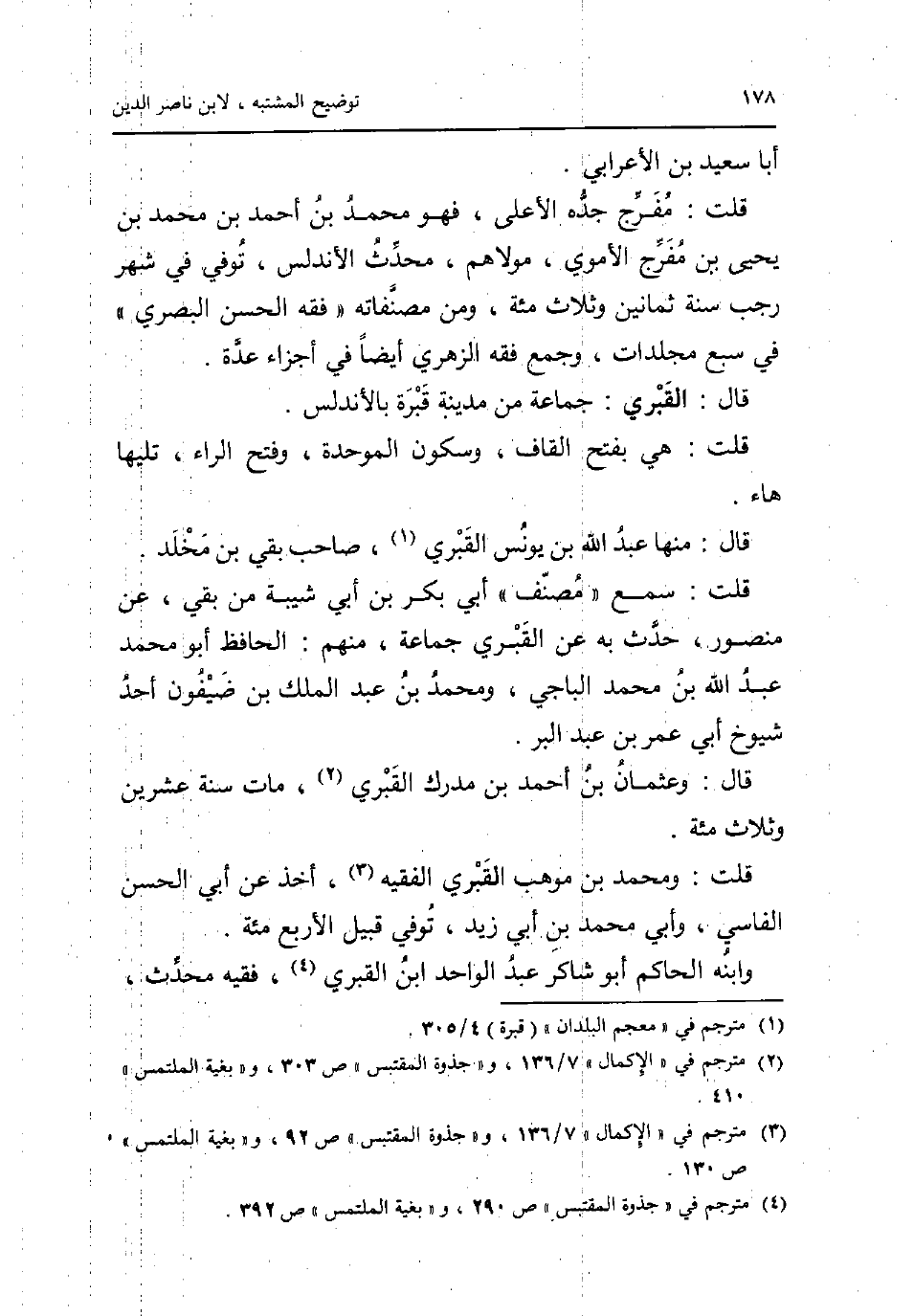 أَبَا سعيد بن الْأَعرَابِي. قلت: مفرج جده الْأَعْلَى فَهُوَ مُحَمَّد بن أَحْمد بن مُحَمَّد بن يحيى بن مفرج الْأمَوِي مَوْلَاهُم مُحدث الأندلس توفّي فِي شهر رَجَب سنة ثَمَانِينَ وَثَلَاث مئة وَمن مصنفاته فقه الْحسن الْبَصْرِيّ فِي سبع مجلدات وَجمع فقه الزُّهْرِيّ أَيْضا فِي أَجزَاء عدَّة. قَالَ: القبري: جمَاعَة من مَدِينَة قبرة بالأندلس. قلت: هِيَ بِفَتْح الْقَاف وَسُكُون الْمُوَحدَة وَفتح الرَّاء تَلِيهَا هَاء. قَالَ: مِنْهَا عبد الله بن يُونُس القبري صَاحب بَقِي بن مخلد. قلت: سمع مُصَنف أبي بكر بن أبي شيبَة من بَقِي عَن مَنْصُور حدث بِهِ عَن القبري جمَاعَة مِنْهُم: الْحَافِظ أَبُو مُحَمَّد عبد الله بن مُحَمَّد الْبَاجِيّ وَمُحَمّد بن عبد الْملك بن ضيفون أحد شُيُوخ أبي عمر بن عبد الْبر. قَالَ: وَعُثْمَان بن أَحْمد بن مدرك القبري مَاتَ سنة عشْرين وَثَلَاث مئة. قلت: وَمُحَمّد بن موهب القبري الْفَقِيه أَخذ عَن أبي الْحسن الفاسي وَأبي مُحَمَّد بن أبي زيد توفّي قبيل الْأَرْبَع مئة. وَابْنه الْحَاكِم أَبُو شَاكر عبد الْوَاحِد ابْن القبري فَقِيه مُحدث