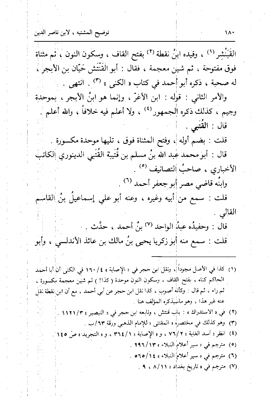 القبنشر وَقَيده ابْن نقطة بِفَتْح الْقَاف وَسُكُون النُّون ثمَّ مثناة فَوق مَفْتُوحَة ثمَّ شين مُعْجمَة فَقَالَ: أَبُو القنتش حَيَّان بن الأبجر لَهُ صُحْبَة ذكره أَبُو أَحْمد فِي كتاب الكنى. انْتهى. وَالْأَمر الثَّانِي: قَوْله: ابْن الْأَغَر وَإِنَّمَا هُوَ ابْن الأبجر بموحدة وجيم كَذَلِك ذكره الْجُمْهُور وَلَا أعلم فِيهِ خلافًا وَالله أعلم. قَالَ: القتبي. قلت: بِضَم أَوله وَفتح الْمُثَنَّاة فَوق تَلِيهَا مُوَحدَة مَكْسُورَة. قَالَ: أَبُو مُحَمَّد عبد الله بن مُسلم بن قُتَيْبَة القتبي الدينَوَرِي الْكَاتِب الأخباري صَاحب التصانيف. وَابْنه قَاضِي مصر أَبُو جَعْفَر أَحْمد. قلت: سمع من أَبِيه وَغَيره وَعنهُ أَبُو عَليّ إِسْمَاعِيل بن الْقَاسِم القالي. قَالَ: وحفيده عبد الْوَاحِد بن أَحْمد حدث. قلت: سمع مِنْهُ أَبُو زَكَرِيَّا يحيى بن مَالك بن عَائِذ الأندلسي وَأَبُو