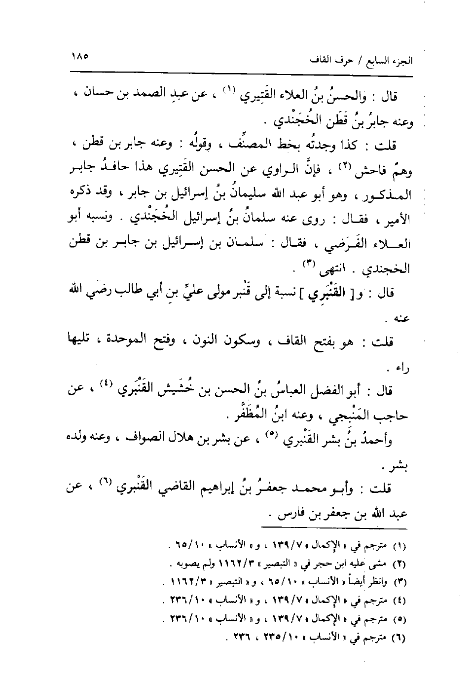قَالَ: وَالْحسن بن الْعَلَاء القتيري عَن عبد الصَّمد بن حسان وَعنهُ جَابر بن قطن الخجندي. قلت: كَذَا وجدته بِخَط المُصَنّف وَقَوله: وَعنهُ جَابر بن قطن وهم فَاحش فَإِن الرَّاوِي عَن الْحسن القتيري هَذَا حافد جَابر الْمَذْكُور وَهُوَ أَبُو عبد الله سُلَيْمَان بن إِسْرَائِيل بن جَابر وَقد ذكره الْأَمِير فَقَالَ: روى عَنهُ سلمَان بن إِسْرَائِيل الخجندي. وَنسبه أَبُو الْعَلَاء الفرضي فَقَالَ: سلمَان بن إِسْرَائِيل بن جَابر بن قطن الخجندي. انْتهى. قَالَ: و [القنبري] نِسْبَة إِلَى قنبر مولى عَليّ بن أبي طَالب رَضِي الله عَنهُ. قلت: هُوَ بِفَتْح الْقَاف وَسُكُون النُّون وَفتح الْمُوَحدَة تَلِيهَا رَاء. قَالَ: أَبُو الْفضل الْعَبَّاس بن الْحسن بن خشيش القنبري عَن حَاجِب المنبجي وَعنهُ ابْن المظفر. وَأحمد بن بشر القنبري عَن بشر بن هِلَال الصَّواف وَعنهُ وَلَده بشر. قلت: وَأَبُو مُحَمَّد جَعْفَر بن إِبْرَاهِيم القَاضِي القنبري عَن عبد الله بن جَعْفَر بن فَارس.