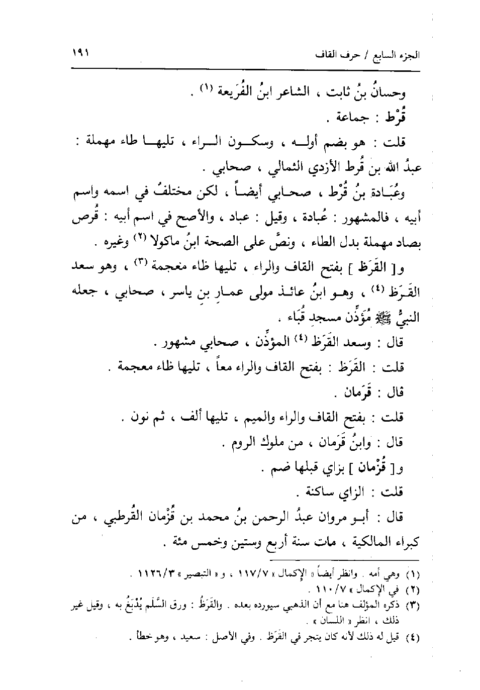 وَحسان بن ثَابت الشَّاعِر ابْن الفريعة. قرط: جمَاعَة. قلت: هُوَ بِضَم أَوله وَسُكُون الرَّاء تَلِيهَا طاء مُهْملَة: عبد الله بن قرط الْأَزْدِيّ الثمالِي صَحَابِيّ. وَعبادَة بن قرط صَحَابِيّ أَيْضا لَكِن مُخْتَلف فِي اسْمه وَاسم أَبِيه فَالْمَشْهُور: عبَادَة وَقيل: عباد وَالأَصَح فِي اسْم أَبِيه: قرص بصاد مُهْملَة بدل الطَّاء وَنَصّ على الصِّحَّة ابْن مَاكُولَا وَغَيره. و [الْقرظ] بِفَتْح الْقَاف وَالرَّاء تَلِيهَا ظاء مُعْجمَة وَهُوَ سعد الْقرظ وَهُوَ ابْن عَائِذ مولى عمار بن يَاسر صَحَابِيّ جعله النَّبِي صلى الله عَلَيْهِ وَسلم مُؤذن مَسْجِد قبَاء. قَالَ: وَسعد الْقرظ الْمُؤَذّن صَحَابِيّ مَشْهُور. قلت: الْقرظ: بِفَتْح الْقَاف وَالرَّاء مَعًا تَلِيهَا ظاء مُعْجمَة. قَالَ: قرمان. قلت: بِفَتْح الْقَاف وَالرَّاء وَالْمِيم تَلِيهَا ألف ثمَّ نون. قَالَ: وَابْن قرمان من مُلُوك الرّوم. و [قزمان] بزاي قبلهَا ضم. قلت: الزَّاي سَاكِنة. قَالَ: أَبُو مَرْوَان عبد الرَّحْمَن بن مُحَمَّد بن قزمان الْقُرْطُبِيّ من كبراء الْمَالِكِيَّة مَاتَ سنة أَربع وَسِتِّينَ وَخمْس مئة.