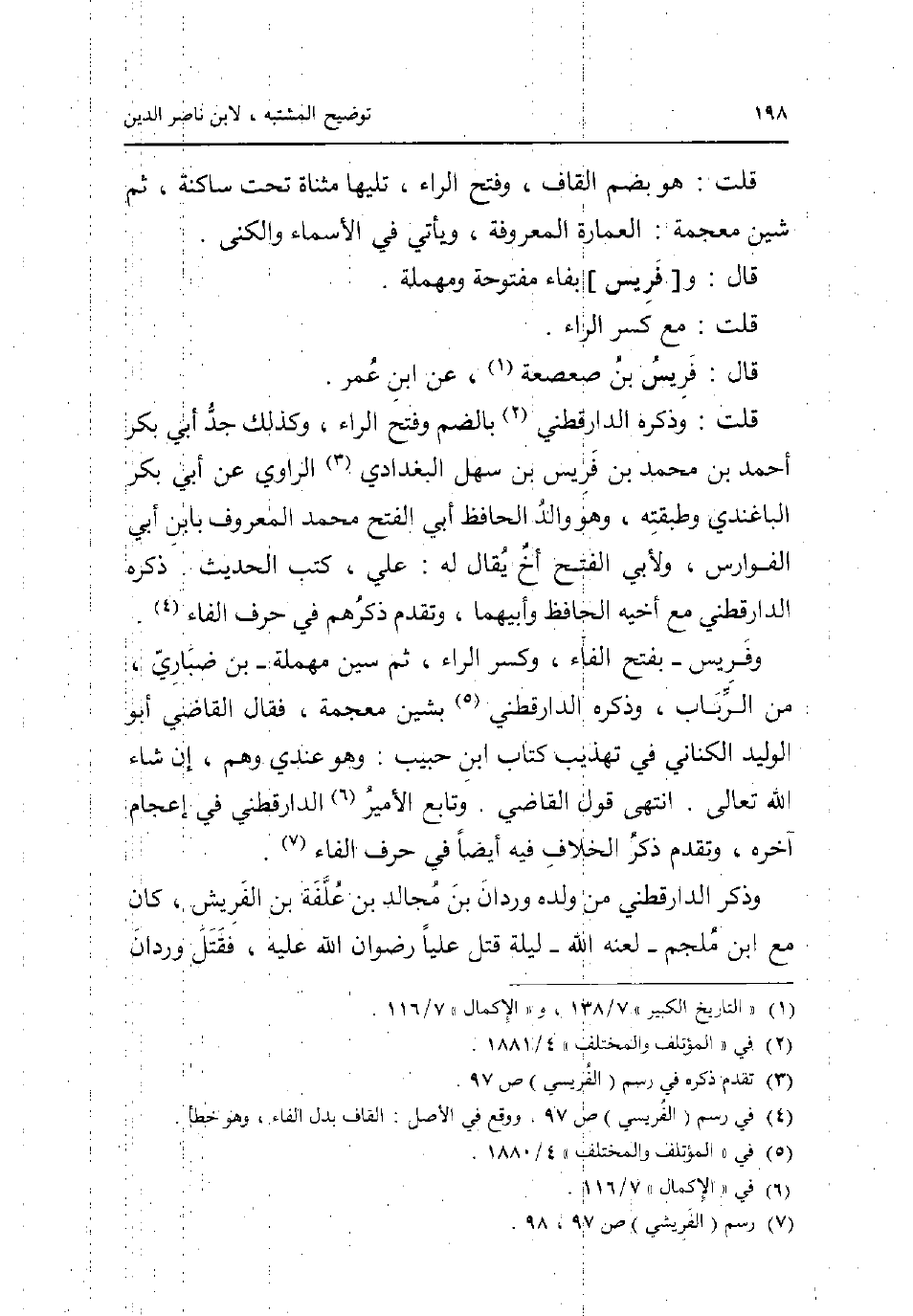 قلت: هُوَ بِضَم الْقَاف وَفتح الرَّاء تَلِيهَا مثناة تَحت سَاكِنة ثمَّ شين مُعْجمَة: الْعِمَارَة الْمَعْرُوفَة وَيَأْتِي فِي الْأَسْمَاء والكنى. قَالَ: و [فريس] بفاء مَفْتُوحَة ومهملة. قلت: مَعَ كسر الرَّاء. قَالَ: فريس بن صعصعة عَن ابْن عمر. قلت: وَذكره الدَّارَقُطْنِيّ بِالضَّمِّ وَفتح الرَّاء وَكَذَلِكَ جد أبي بكر أَحْمد بن مُحَمَّد بن فريس بن سهل الْبَغْدَادِيّ الرَّاوِي عَن أبي بكر الباغندي وطبقته وَهُوَ وَالِد الْحَافِظ أبي الْفَتْح مُحَمَّد الْمَعْرُوف بِابْن أبي الفوارس وَلأبي الْفَتْح أَخ يُقَال لَهُ: عَليّ كتب الحَدِيث. ذكره الدَّارَقُطْنِيّ مَعَ أَخِيه الْحَافِظ وأبيهما وَتقدم ذكرهم فِي حرف الْفَاء. وفريس _ بِفَتْح الْفَاء وَكسر الرَّاء ثمَّ سين مُهْملَة _ بن ضباري من الربَاب وَذكره الدَّارَقُطْنِيّ بشين مُعْجمَة فَقَالَ القَاضِي أَبُو الْوَلِيد الْكِنَانِي فِي تَهْذِيب كتاب ابْن حبيب: وَهُوَ عِنْدِي وهم إِن شَاءَ الله تَعَالَى. انْتهى قَول القَاضِي. وتابع الْأَمِير الدَّارَقُطْنِيّ فِي إعجام آخِره وَتقدم ذكر الْخلاف فِيهِ أَيْضا فِي حرف الْفَاء. وَذكر الدَّارَقُطْنِيّ من وَلَده وردان بن مجَالد بن علفة بن الفريش كَانَ مَعَ ابْن ملجم _ لَعنه الله _ لَيْلَة قتل عليا رضوَان اله علييه فَقتل وردان