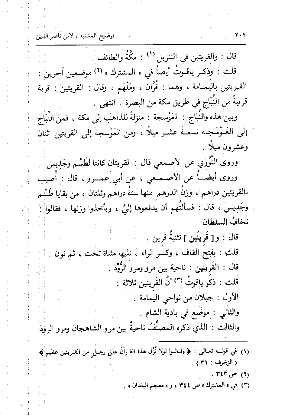 قَالَ: والقريتين فِي التَّنْزِيل: مَكَّة والطائف. قلت: وَذكر ياقوت أَيْضا فِي الْمُشْتَرك موضِعين آخَرين: القريتين بِالْيَمَامَةِ وهما: قرَان وملهم وَقَالَ: القريتين: قَرْيَة قَرْيَة من النباج فِي طَرِيق مَكَّة من الْبَصْرَة. انْتهى. وَبَين هَذِه والنباج: العوسجة: منزلَة للذاهب إِلَى مَكَّة فَمن النباج إِلَى العوسجة تِسْعَة عشر ميلًا وَمن العوسجة إِلَى القريتين اثْنَان وَعِشْرُونَ ميلًا. وروى التوزي عَن الْأَصْمَعِي قَالَ: القريتان كَانَتَا لطسم وجديس. وروى أَيْضا عَن الْأَصْمَعِي عَن أبي عَمْرو قَالَ: أُصِيب بالقريتين دَرَاهِم وزن الدِّرْهَم مِنْهَا سِتَّة دَرَاهِم وَثُلُثَانِ من بقايا طسم وجديس قَالَ: فسألتهم أَن يدفعوها إِلَيّ ويأخذوا وَزنهَا فَقَالُوا: نَخَاف السُّلْطَان. قَالَ: و [قرينين] تَثْنِيَة قرين. قلت: بِفَتْح الْقَاف وَكسر الرَّاء تَلِيهَا مثناة تَحت ثمَّ نون. قَالَ: القرينين: نَاحيَة بَين مرو ومرو الروذ. قلت: ذكر ياقوت أَن القرينين ثَلَاثَة: الأول: جبلان من نواحي الْيَمَامَة. وَالثَّانِي: مَوضِع فِي بادية الشَّام. وَالثَّالِث: الَّذِي ذكره المُصَنّف نَاحيَة بَين مرو الشاهجان ومرو الروذ