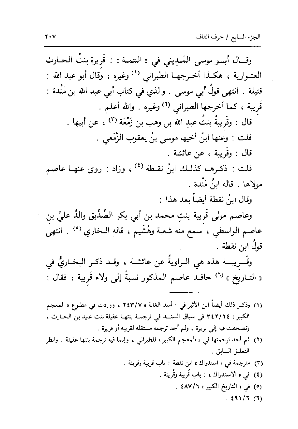 وَقَالَ أَبُو مُوسَى الْمَدِينِيّ فِي التَّتِمَّة: قريرة بنت الْحَارِث العتوارية هَكَذَا أخرجهَا الطَّبَرَانِيّ وَغَيره وَقَالَ أَبُو عبد الله: قتيلة. انْتهى قَول أبي مُوسَى. وَالَّذِي فِي كتاب أبي عبد الله بن مندة: قريبَة كَمَا أخرجهَا الطَّبَرَانِيّ وَغَيره. وَالله أعلم. قَالَ: وَقَرِيبَة بنت عبد الله بن وهب بن زَمعَة عَن أَبِيهَا. قلت: وعنها ابْن أَخِيهَا مُوسَى بن يَعْقُوب الزمعِي. قَالَ: وَقَرِيبَة عَن عَائِشَة. قلت: ذكرهَا كَذَلِك ابْن نقطة وَزَاد: روى عَنْهَا عَاصِم مَوْلَاهَا. قَالَه ابْن مندة. وَقَالَ ابْن نقطة أَيْضا بعد هَذَا: وَعَاصِم مولى قريبَة بنت مُحَمَّد بن أبي بكر الصّديق وَالِد عَليّ بن عَاصِم الوَاسِطِيّ سمع مِنْهُ شُعْبَة وهشيم قَالَه البُخَارِيّ. انْتهى قَول ابْن نقطة. وَقَرِيبَة هَذِه هِيَ الراوية عَن عَائِشَة وَقد ذكر البُخَارِيّ فِي التَّارِيخ حافد عَاصِم الْمَذْكُور نِسْبَة إِلَى وَلَاء قريبَة فَقَالَ:
