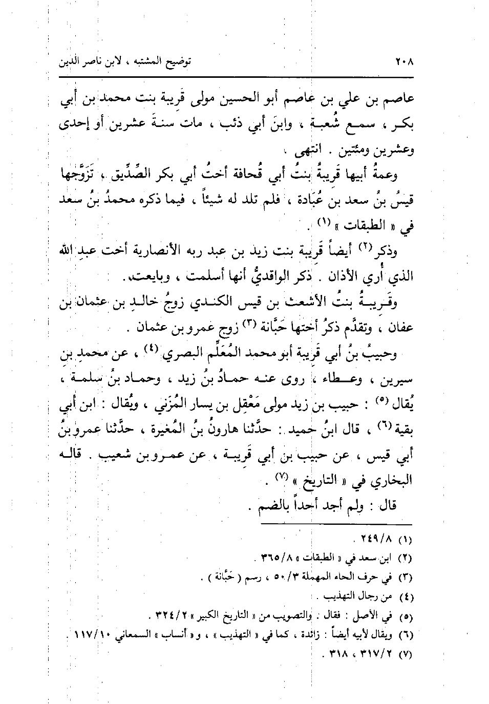 عَاصِم بن عَليّ بن عَاصِم أَبُو الْحُسَيْن مولى قريبَة بنت مُحَمَّد بن أبي بكر سمع شُعْبَة وَابْن أبي ذِئْب مَاتَ سنة عشْرين أَو إِحْدَى وَعشْرين ومئتين. انْتهى. وعمة أَبِيهَا قريبَة بنت أبي قُحَافَة أُخْت أبي بكر الصّديق تزَوجهَا قيس بن سعد بن عبَادَة فَلم تَلد لَهُ شَيْئا فِيمَا ذكره مُحَمَّد بن سعد فِي الطَّبَقَات. وَذكر أَيْضا قريبَة بنت زيد بن عبد ربه الْأَنْصَارِيَّة أُخْت عبد الله الَّذِي أرِي الْأَذَان. ذكر الْوَاقِدِيّ أَنَّهَا أسلمت وبايعت. وَقَرِيبَة بنت الْأَشْعَث بن قيس الْكِنْدِيّ زوج خَالِد بن عُثْمَان بن عَفَّان وَتقدم ذكر أُخْتهَا حبانة زوج عَمْرو بن عُثْمَان. وحبِيب بن أبي قريبَة أَبُو مُحَمَّد الْمعلم الْبَصْرِيّ عَن مُحَمَّد بن سِيرِين وَعَطَاء روى عَنهُ حَمَّاد بن زيد وَحَمَّاد بن سَلمَة يُقَال: حبيب بن زيد مولى معقل بن يسَار الْمُزنِيّ وَيُقَال: ابْن أبي بَقِيَّة قَالَ ابْن حميد: حَدثنَا هَارُون بن الْمُغيرَة حَدثنَا عَمْرو بن أبي قيس عَن حبيب بن أبي قريبَة عَن عَمْرو بن شُعَيْب. قَالَه البُخَارِيّ فِي التَّارِيخ. قَالَ: وَلم أجد أحدا بِالضَّمِّ.