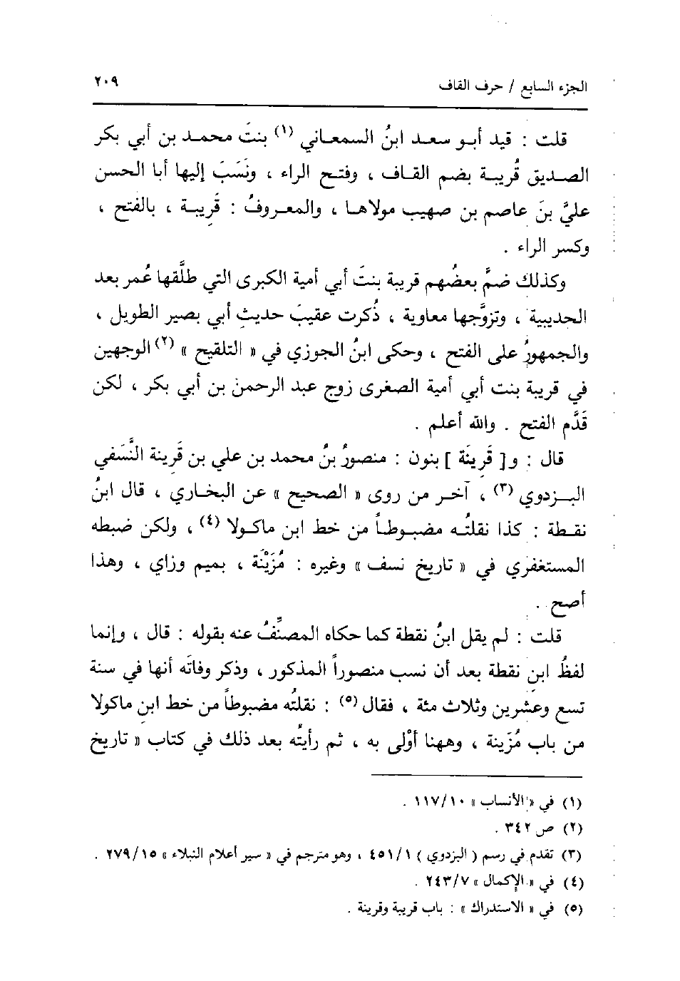 قلت: قيد أَبُو سعد ابْن السَّمْعَانِيّ بنت مُحَمَّد بن أبي بكر الصّديق قريبَة بِضَم الْقَاف وَفتح الرَّاء وَنسب إِلَيْهَا أَبَا الْحسن عَليّ بن عَاصِم بن صُهَيْب مَوْلَاهَا وَالْمَعْرُوف: قريبَة بِالْفَتْح وَكسر الرَّاء. وَكَذَلِكَ ضم بَعضهم قريبَة بنت أبي أُميَّة الْكُبْرَى الَّتِي طَلقهَا عمر بعد الْحُدَيْبِيَة وَتَزَوجهَا مُعَاوِيَة ذكرت عقيب حَدِيث أبي بَصِير الطَّوِيل وَالْجُمْهُور على الْفَتْح وَحكى ابْن الْجَوْزِيّ فِي التلقيح الْوَجْهَيْنِ فِي قريبَة بنت أبي أُميَّة الصُّغْرَى زوج عبد الرَّحْمَن بن أبي بكر لَكِن قدم الْفَتْح. وَالله أعلم. قَالَ: و [قرينَة] بنُون: مَنْصُور بن مُحَمَّد بن عَليّ بن قرينَة النَّسَفِيّ الْبَزْدَوِيّ آخر من روى الصَّحِيح عَن البُخَارِيّ قَالَ ابْن نقطة: كَذَا نقلته مضبوطا من خطّ ابْن مَاكُولَا وَلَكِن ضَبطه المستغفري فِي تَارِيخ نسف وَغَيره: مزينة بميم وزاي وَهَذَا أصح. قلت: لم يقل ابْن نقطة كَمَا حَكَاهُ المُصَنّف عَنهُ بقوله: قَالَ وَإِنَّمَا لفظ ابْن نقطة بعد أَن نسب منصورا الْمَذْكُور وَذكر وَفَاته أَنَّهَا فِي سنة تسع وَعشْرين وَثَلَاث مئة فَقَالَ: نقلته مضبوطا من خطّ ابْن مَاكُولَا من بَاب مزينة وَهَهُنَا أولى بِهِ ثمَّ رَأَيْته بعد ذَلِك فِي كتاب تَارِيخ