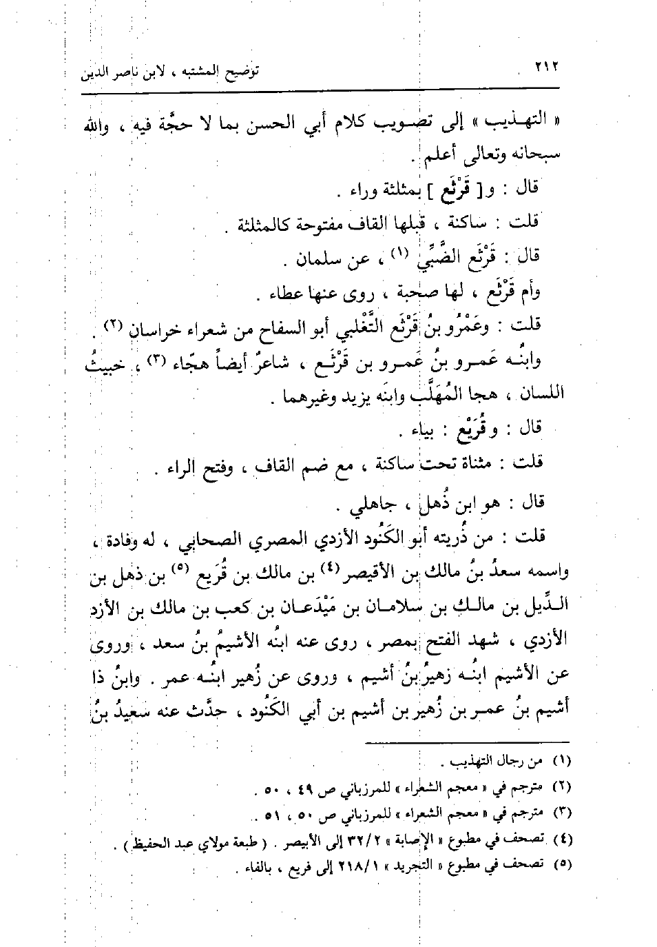 التَّهْذِيب إِلَى تصويب كَلَام أبي الْحسن بِمَا لَا حجَّة فِيهِ وَالله سُبْحَانَهُ وَتَعَالَى أعلم. قَالَ: و [قرثع] بمثلثة وَرَاء. قلت: سَاكِنة قبلهَا الْقَاف مَفْتُوحَة كالمثلثة. قَالَ: قرثع الضَّبِّيّ عَن سلمَان. وام قرثع لَهَا صُحْبَة روى عَنْهَا عَطاء. قلت: وَعَمْرو بن قرثع التغلبي أَبُو السفاح من شعراء خُرَاسَان. وَابْنه عَمْرو بن عَمْرو بن قرثع شَاعِر أَيْضا هجاء خَبِيث اللِّسَان هجا الْمُهلب وَابْنه يزِيد وَغَيرهمَا. قَالَ: وقريع: بياء. قلت: مثناة تَحت سَاكِنة مَعَ ضم الْقَاف وَفتح الرَّاء. قَالَ: هُوَ ابْن ذهل جاهلي. قلت: من ذُريَّته أَبُو الكنود الْأَزْدِيّ الْمصْرِيّ الصَّحَابِيّ لَهُ وفادة واسْمه سعد بن مَالك بن الأقيصر بن مَالك بن قريع بن ذهل بن الديل بن مَالك بن سلامان بن ميدعان بن كَعْب بن مَالك بن الأزد الْأَزْدِيّ شهد الْفَتْح بِمصْر روى عَنهُ ابْنه الأشيم بن سعد وروى عَن الأشيم ابْنه زُهَيْر بن أَشْيَم وروى عَن زُهَيْر ابْنه عمر. وَابْن ذَا أَشْيَم بن عمر بن زُهَيْر بن أَشْيَم بن أبي الكنود حدث عَنهُ سعيد بن