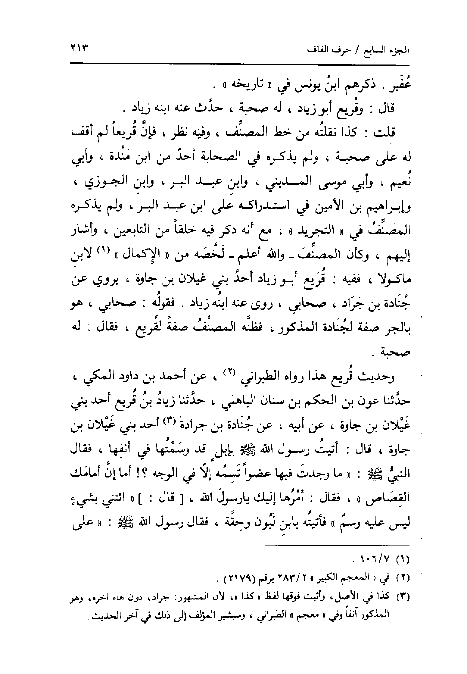 عفير. ذكرهم ابْن يُونُس فِي تَارِيخه. قَالَ: وقريع أَبُو زِيَاد لَهُ صُحْبَة حدث عَنهُ ابْنه زِيَاد. قلت: كَذَا نقلته من خطّ المُصَنّف وَفِيه نظر فَإِن قريعا لم أَقف لَهُ على صُحْبَة وَلم يذكرهُ فِي الصَّحَابَة أحد من ابْن مندة وَأبي نعيم وَأبي مُوسَى الْمَدِينِيّ وَابْن عبد الْبر وَابْن الْجَوْزِيّ وَإِبْرَاهِيم بن الْأمين فِي استدراكه على ابْن عبد الْبر وَلم يذكرهُ المُصَنّف فِي التَّجْرِيد مَعَ أَنه ذكر فِيهِ خلقا من التَّابِعين وَأَشَارَ إِلَيْهِم وَكَأن المُصَنّف _ وَالله أعلم _ لخصه من الْإِكْمَال لِابْنِ مَاكُولَا فَفِيهِ: قريع أَبُو زِيَاد أحد بني غيلَان بن جاوة يروي عَن جُنَادَة بن جَراد صَحَابِيّ روى عَنهُ ابْنه زِيَاد. فَقَوله: صَحَابِيّ هُوَ بِالْجَرِّ صفة لجنادة الْمَذْكُور فَظَنهُ المُصَنّف صفة لقريع فَقَالَ: لَهُ صُحْبَة. وَحَدِيث قريع هَذَا رَوَاهُ الطَّبَرَانِيّ عَن أَحْمد بن دَاوُد الْمَكِّيّ حَدثنَا عون بن الحكم بن سِنَان الْبَاهِلِيّ حَدثنَا زِيَاد بن قريع أحد بني غيلَان بن جاوة عَن أَبِيه عَن جُنَادَة بن جَرَادَة أحد بني غيلَان بن جاوة قَالَ: أتيت رَسُول الله صلى الله عَلَيْهِ وَسلم بِإِبِل قد وسمتها فِي أنفها فَقَالَ النَّبِي صلى الله عَلَيْهِ وَسلم: مَا وجدت فِيهَا عضوا تسمه إِلَّا فِي الْوَجْه؟ ! أما إِن أمامك الْقصاص فَقَالَ: أمرهَا إِلَيْك يَا رَسُول الله [قَالَ:] ائْتِنِي بِشَيْء لَيْسَ عَلَيْهِ وسم فَأَتَيْته بِابْن لبون وحقة فَقَالَ رسو الله صلى الله عَلَيْهِ وَسلم: على