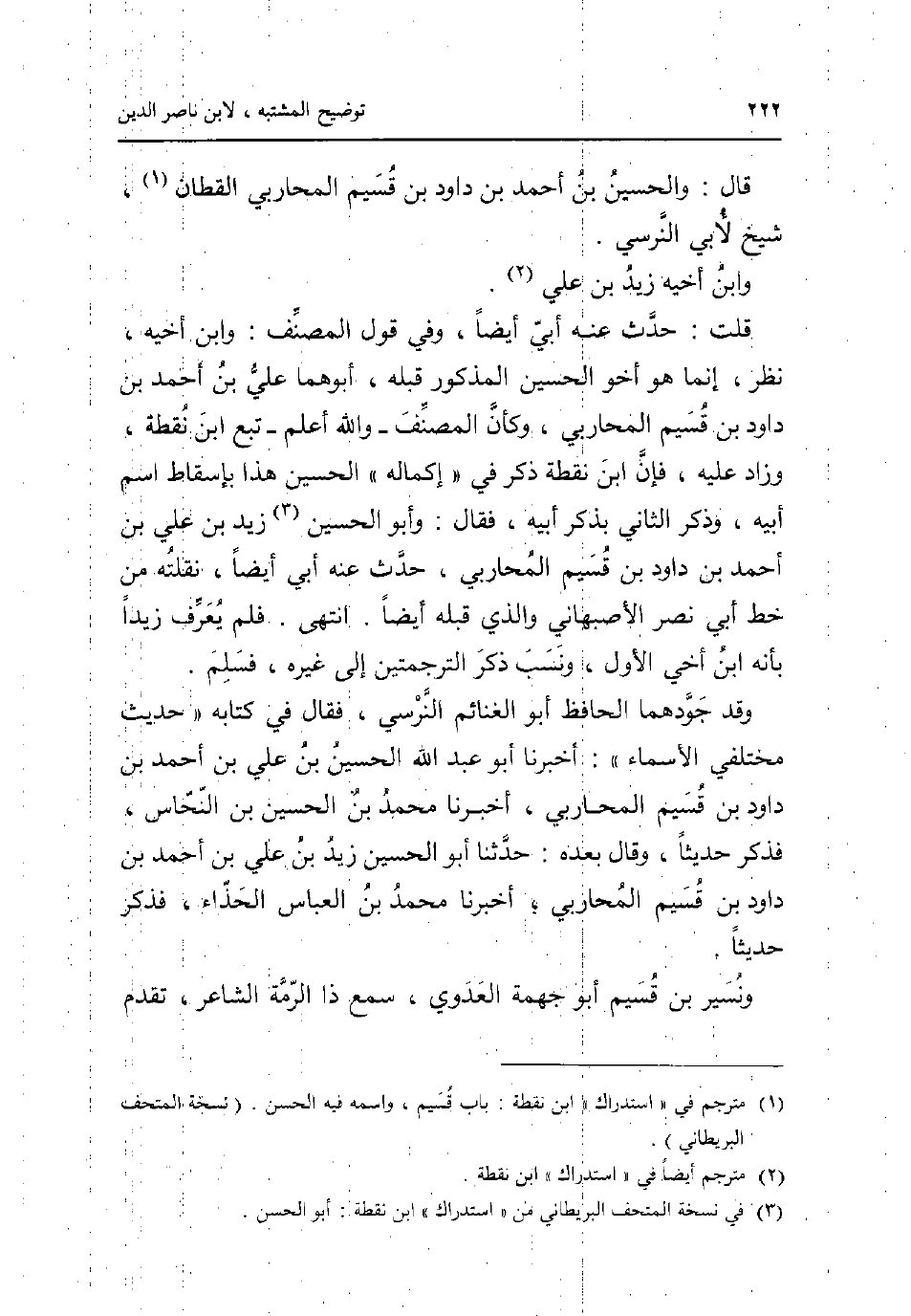 قَالَ: وَالْحُسَيْن بن أَحْمد بن دَاوُد بن قسيم الْمحَاربي الْقطَّان شيخ لأبي النَّرْسِي. وَابْن أَخِيه زيد بن عَليّ. قلت: حدث عَنهُ أبي أَيْضا وَفِي قَول المُصَنّف: وَابْن أَخِيه نظر إِنَّمَا هُوَ أَخُو الْحُسَيْن الْمَذْكُور قبله أَبوهُمَا عَليّ بن أَحْمد بن دَاوُد بن قسيم الْمحَاربي وَكَأن المُصَنّف _ وَالله أعلم _ تبع ابْن نقطة وَزَاد عَلَيْهِ فَإِن ابْن نقطة ذكر فِي إكماله الْحُسَيْن هَذَا بِإِسْقَاط اسْم أَبِيه وَذكر الثَّانِي بِذكر أَبِيه فَقَالَ: وَأَبُو الْحُسَيْن زيد بن عَليّ بن أَحْمد بن دَاوُد بن قسيم الْمحَاربي حدث عَنهُ أبي أَيْضا نقلته من خطّ أبي نصر الْأَصْبَهَانِيّ وَالَّذِي قبله أَيْضا. انْتهى. فَلم يعرف زيدا بِأَنَّهُ ابْن أخي الأول وَنسب ذكر الترجمتين إِلَى غَيره فَسلم. وَقد جودهما الْحَافِظ أَبُو الْغَنَائِم النَّرْسِي فَقَالَ فِي كِتَابه حَدِيث مختلفي الْأَسْمَاء: أخبرنَا أَبُو عبد الله الْحُسَيْن بن عَليّ بن أَحْمد بن دَاوُد بن قسيم الْمحَاربي أخبرنَا مُحَمَّد بن الْحُسَيْن بن النّحاس فَذكر حَدِيثا وَقَالَ بعده: حَدثنَا أَبُو الْحُسَيْن زيد بن عَليّ بن أَحْمد بن دَاوُد بن قسيم الْمحَاربي؛ أخبرنَا مُحَمَّد بن الْعَبَّاس الْحذاء فَذكر حَدِيثا. ونسير بن قسيم أَبُو جهمة الْعَدوي سمع ذَا الرمة الشَّاعِر تقدم