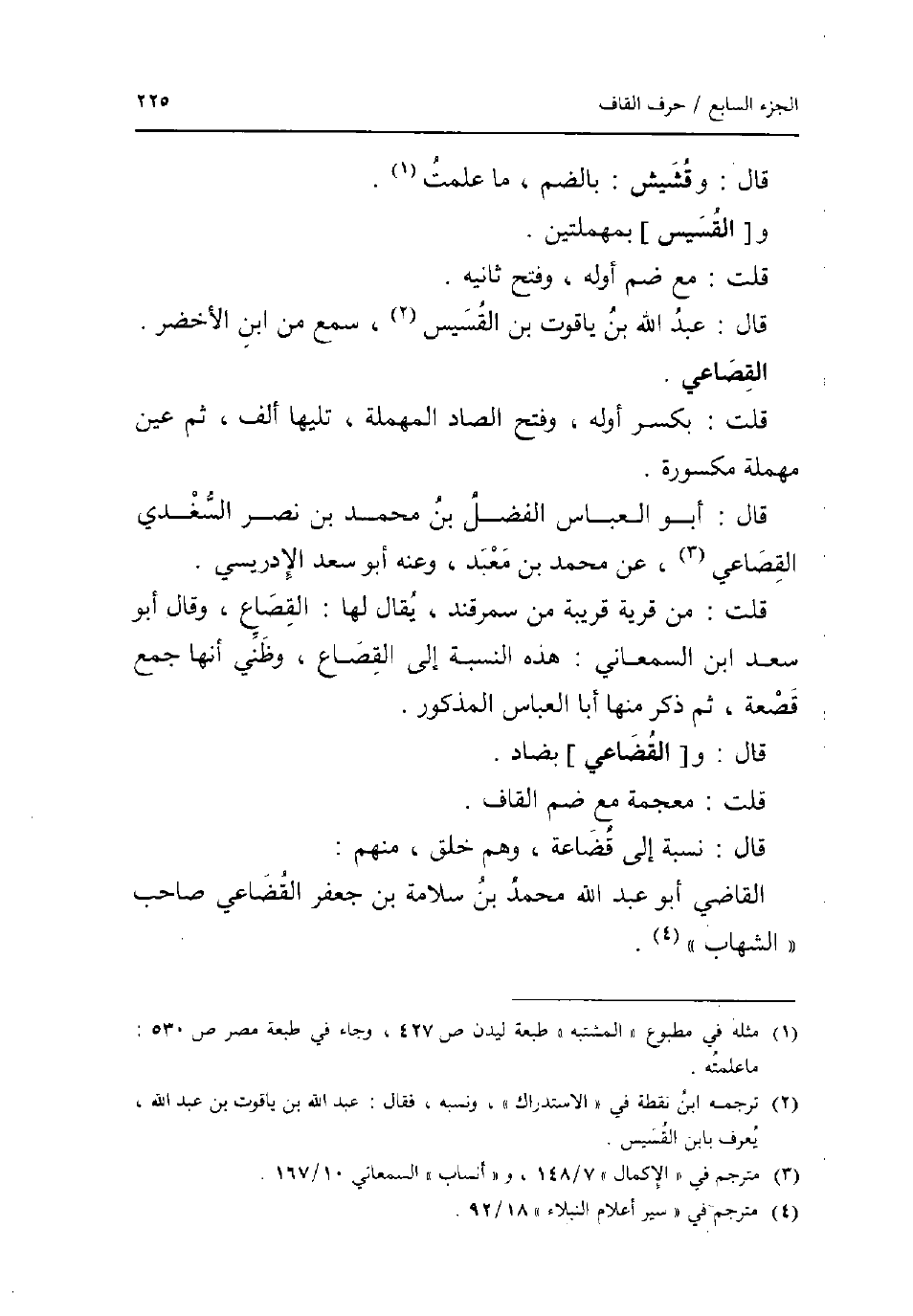 قَالَ: وقشيش: بِالضَّمِّ مَا علمت. و [القسيس] بمهملتين. قلت: مَعَ ضم أَوله وَفتح ثَانِيه. قَالَ: عبد الله بن ياقوت بن القسيس سمع من ابْن الْأَخْضَر. القصاعي. قلت: بِكَسْر أَوله وَفتح الصَّاد الْمُهْملَة تَلِيهَا ألف ثمَّ عين مُهْملَة مَكْسُورَة. قَالَ: أَبُو الْعَبَّاس الْفضل بن مُحَمَّد بن نصر السغدي القصاعي عَن مُحَمَّد بن معبد وَعنهُ أَبُو سعد الإدريسي. قلت: من قَرْيَة قريبَة من سَمَرْقَنْد يُقَال لَهَا: القصاع وَقَالَ أَبُو سعد ابْن السَّمْعَانِيّ: هَذِه النِّسْبَة إِلَى القصاع وظني أَنَّهَا جمع قَصْعَة ثمَّ ذكر مِنْهَا أَبَا الْعَبَّاس الْمَذْكُور. قَالَ: و [الْقُضَاعِي] بضاد. قلت: مُعْجمَة مَعَ ضم الْقَاف. قَالَ: نِسْبَة إِلَى قضاعة وهم خلق مِنْهُم: القَاضِي أَبُو عبد الله مُحَمَّد بن سَلامَة بن جَعْفَر الْقُضَاعِي صَاحب الشهَاب.