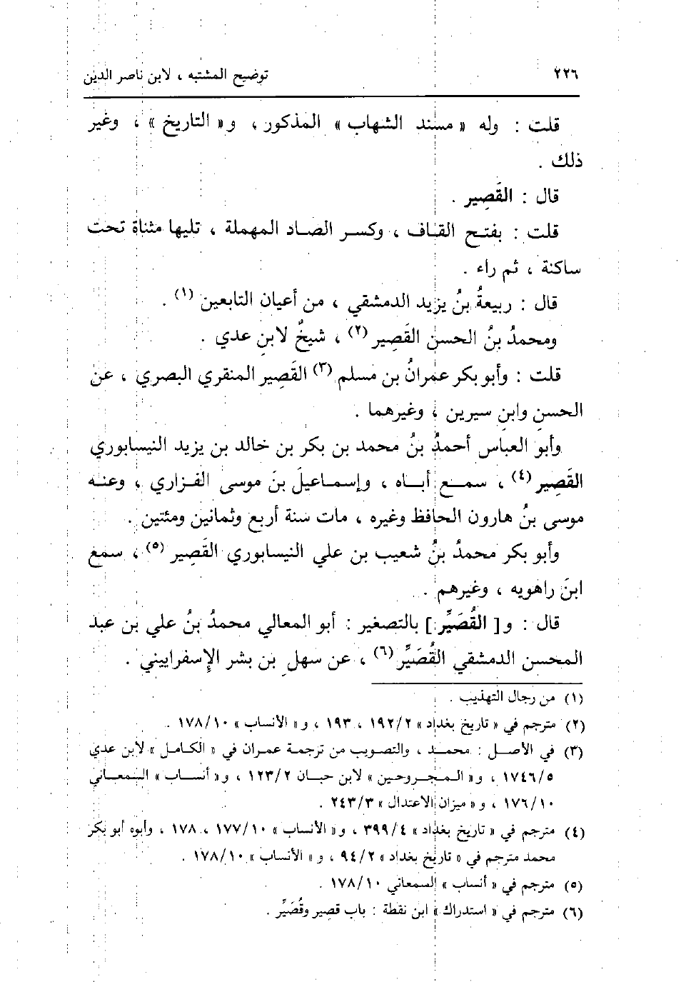قلت: وَله مُسْند الشهَاب الْمَذْكُور والتاريخ وَغير ذَلِك. قَالَ: الْقصير. قلت: بِفَتْح الْقَاف وَكسر الصَّاد الْمُهْملَة تَلِيهَا مثناة تَحت سَاكِنة ثمَّ رَاء. قَالَ: ربيعَة بن يزِيد الدِّمَشْقِي من أَعْيَان التَّابِعين. وَمُحَمّد بن الْحسن الْقصير شيخ لِابْنِ عدي. قلت: وَأَبُو بكر عمرَان بن مُسلم الْقصير الْمنْقري الْبَصْرِيّ عَن الْحسن وَابْن سِيرِين وَغَيرهمَا. وَأَبُو الْعَبَّاس أَحْمد بن مُحَمَّد بن بكر بن خَالِد بن يزِيد النَّيْسَابُورِي الْقصير سمع أَبَاهُ وَإِسْمَاعِيل بن مُوسَى الْفَزارِيّ وَعنهُ مُوسَى بن هَارُون الْحَافِظ وَغَيره مَاتَ سنة أَربع وَثَمَانِينَ ومئتين. وَأَبُو بكر مُحَمَّد بن شُعَيْب بن عَليّ النَّيْسَابُورِي الْقصير سمع ابْن رَاهَوَيْه وَغَيرهم. قَالَ: و [الْقصير] بِالتَّصْغِيرِ: أَبُو الْمَعَالِي مُحَمَّد بن عَليّ بن عبد المحسن الدِّمَشْقِي الْقصير عَن سهل بن بشر الإِسْفِرَايِينِيّ.