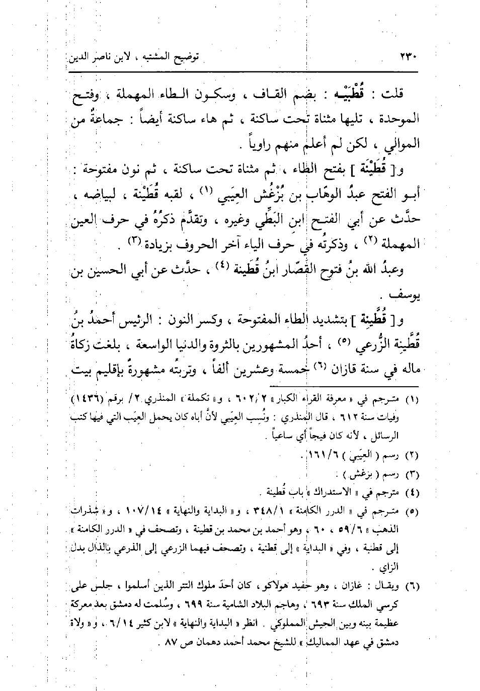 قلت: قطبيه: بِضَم الْقَاف وَسُكُون الطَّاء الْمُهْملَة وَفتح الْمُوَحدَة تَلِيهَا مثناة تَحت سَاكِنة ثمَّ هَاء سَاكِنة أَيْضا: جمَاعَة من الموَالِي لَكِن لم أعلم مِنْهُم رَاوِيا. و [قطينة] بِفَتْح الطَّاء ثمَّ مثناة تَحت سَاكِنة ثمَّ نون مَفْتُوحَة: أَبُو الْفَتْح عبد الْوَهَّاب بن بزغش العيبي لقبه قطينة لبياضه حدث عَن أبي الْفَتْح ابْن البطي وَغَيره وَتقدم ذكره فِي حرف الْعين الْمُهْملَة وذكرته فِي حرف الْيَاء آخر الْحُرُوف بِزِيَادَة. وَعبد الله بن فتوح الْقصار ابْن قطينة حدث عَن أبي الْحُسَيْن بن يُوسُف. و [قطينة] بتَشْديد الطَّاء الْمَفْتُوحَة وَكسر النُّون: الرئيس أَحْمد بن قطينة الزرعي أحد الْمَشْهُورين بالثروة وَالدُّنْيَا الواسعة بلغت زَكَاة مَاله فِي سنة قازان خَمْسَة وَعشْرين ألفا وتربته مَشْهُورَة بإقليم بَيت