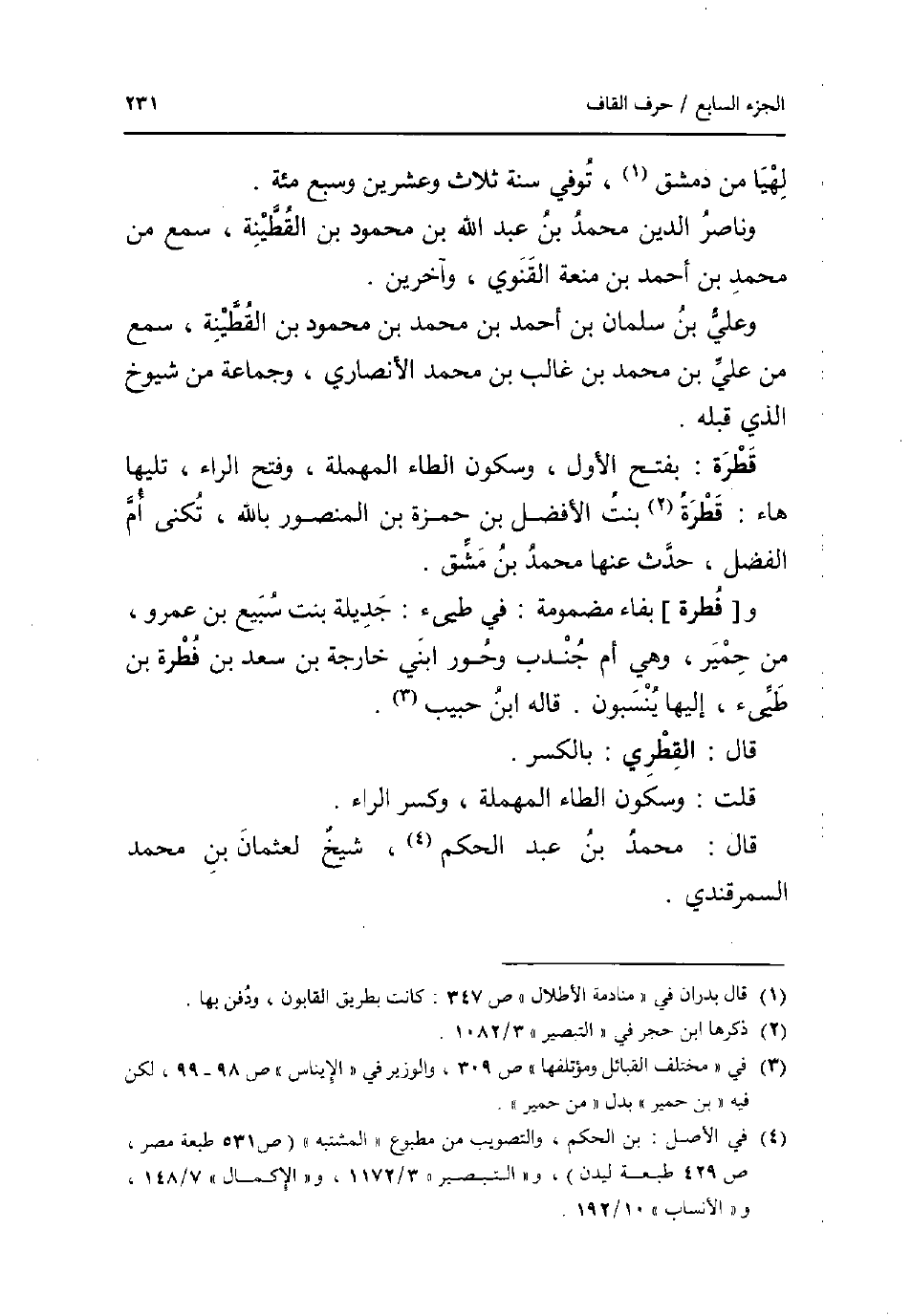 لهيا من دمشق توفّي سنة ثَلَاث وَعشْرين وَسبع مئة. وناصر الدّين مُحَمَّد بن عبد الله بن مَحْمُود بن القطينة سمع من مُحَمَّد بن أَحْمد بن مَنْعَة القنوي وَآخَرين. وَعلي بن سلمَان بن أَحْمد بن مُحَمَّد بن مَحْمُود بن القطينة سمع من عَليّ بن مُحَمَّد بن غَالب بن مُحَمَّد الْأنْصَارِيّ وَجَمَاعَة من شُيُوخ الَّذِي قبله. قَطْرَة: بِفَتْح الأول وَسُكُون الطَّاء الْمُهْملَة وَفتح الرَّاء تَلِيهَا هَاء: قَطْرَة بنت الْأَفْضَل بن حَمْزَة بن الْمَنْصُور بِاللَّه تكنى أم الْفضل حدث عَنْهَا مُحَمَّد بن مشق. و [فطْرَة] بفاء مَضْمُومَة: فِي طَيئ: جديلة بنت سبيع بن عَمْرو من حمير وَهِي أم جُنْدُب وحور ابْني خَارِجَة بن سعد بن فطْرَة بن طَيئ إِلَيْهَا ينسبون. قَالَه ابْن حبيب. قَالَ: القطري: بِالْكَسْرِ. قلت: وَسُكُون الطَّاء الْمُهْملَة وَكسر الرَّاء. قَالَ: مُحَمَّد بن عبد الحكم شيخ لعُثْمَان بن مُحَمَّد السَّمرقَنْدِي.