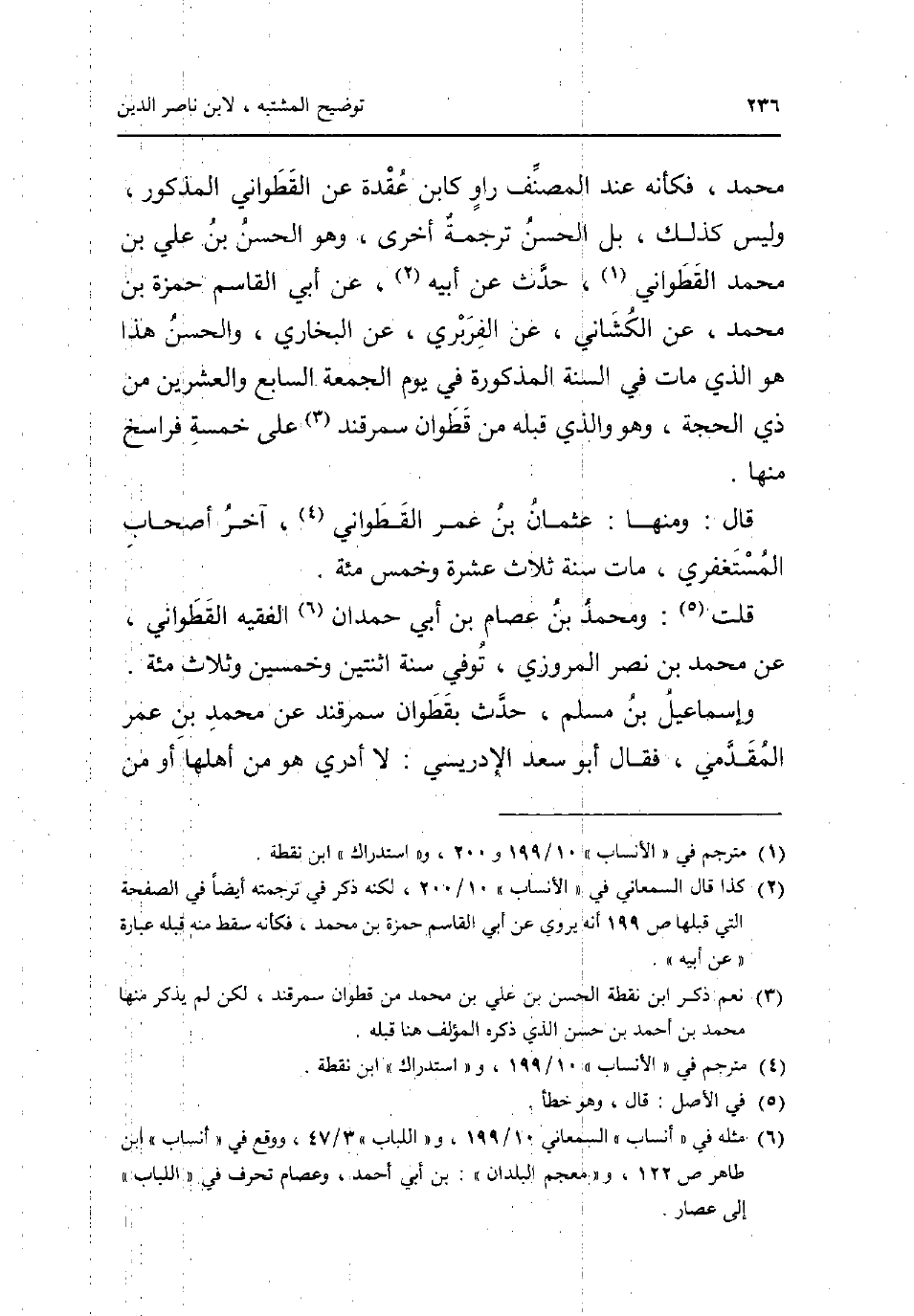 مُحَمَّد فَكَأَنَّهُ عِنْد المُصَنّف راو كَابْن عقدَة عَن الْقَطوَانِي الْمَذْكُور وَلَيْسَ كَذَلِك بل الْحسن تَرْجَمَة أُخْرَى وَهُوَ الْحسن بن عَليّ بن مُحَمَّد الْقَطوَانِي حدث عَن أَبِيه عَن أبي الْقَاسِم حَمْزَة بن مُحَمَّد عَن الكشاني عَن الْفربرِي عَن البُخَارِيّ وَالْحسن هَذَا هُوَ الَّذِي مَاتَ فِي السّنة الْمَذْكُورَة فِي يَوْم الْجُمُعَة السَّابِع وَالْعِشْرين من ذِي الْحجَّة وَهُوَ وَالَّذِي قبله من قطوان سَمَرْقَنْد على خَمْسَة فراسخ مِنْهَا. قَالَ: وَمِنْهَا: عُثْمَان بن عمر الْقَطوَانِي آخر أَصْحَاب المستغفري مَاتَ سنة ثَلَاث عشرَة وَخمْس مئة. قلت: وَمُحَمّد بن عِصَام بن أبي حمدَان الْفَقِيه الْقَطوَانِي عَن مُحَمَّد بن نصر الْمروزِي توفّي سنة اثْنَتَيْنِ وَخمسين وَثَلَاث مئة. وَإِسْمَاعِيل بن مُسلم حدث بقطوان سَمَرْقَنْد عَن مُحَمَّد بن عمر الْمقدمِي فَقَالَ أَبُو سعد الإدريسي: لَا أَدْرِي هُوَ من أَهلهَا أَو من