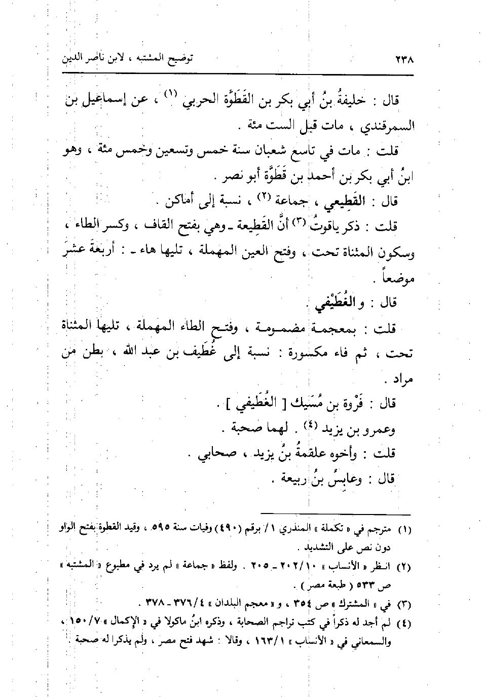 قَالَ: خَليفَة بن أبي بكر بن القطوة الْحَرْبِيّ عَن إِسْمَاعِيل بن السَّمرقَنْدِي مَاتَ قبل السِّت مئة. قلت: مَاتَ فِي تَاسِع شعْبَان سنة خمس وَتِسْعين وَخمْس مئة وَهُوَ ابْن أبي بكر بن أَحْمد بن قطوة أَبُو نصر. قَالَ: الْقطيعِي جمَاعَة نِسْبَة إِلَى أَمَاكِن. قلت: ذكر ياقوت أَن القطيعة _ وَهِي بِفَتْح الْقَاف وَكسر الطَّاء وَسُكُون الْمُثَنَّاة تَحت وَفتح الْعين الْمُهْملَة تَلِيهَا هَاء _: أَرْبَعَة عشر موضعا. قَالَ: والغطيفي. قلت: بِمُعْجَمَة مَضْمُومَة وَفتح الطَّاء الْمُهْملَة تَلِيهَا الْمُثَنَّاة تَحت ثمَّ فَاء مَكْسُورَة: نِسْبَة إِلَى غطيف بن عبد الله بطن من مُرَاد. قَالَ: فَرْوَة بن مسيك [الغطيفي] . وَعَمْرو بن يزِيد. لَهما صُحْبَة. قلت: وَأَخُوهُ عَلْقَمَة بن يزِيد صَحَابِيّ. قَالَ: وعابس بن ربيعَة.