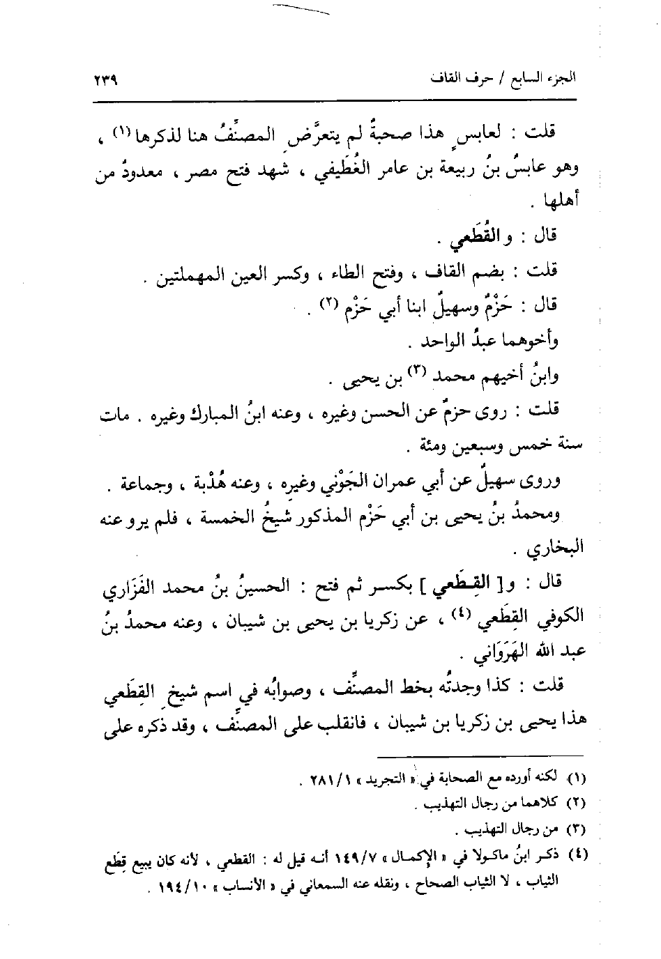 قلت: لعابس هَذَا صُحْبَة لم يتَعَرَّض المُصَنّف هُنَا لذكرها وَهُوَ عَابس بن ربيعَة بن عَامر الغطيفي شهد فتح مصر مَعْدُود من أَهلهَا. قَالَ: والقطعي. قلت: بِضَم الْقَاف وَفتح الطَّاء وَكسر الْعين الْمُهْمَلَتَيْنِ. قَالَ: حزم وَسُهيْل ابْنا أبي حزم. وأخوهما عبد الْوَاحِد. وَابْن أخيهم مُحَمَّد بن يحيى. قلت: روى حزم عَن الْحسن وَغَيره وَعنهُ ابْن الْمُبَارك وَغَيره. مَاتَ سنة خمس وَسبعين ومئة. وروى سُهَيْل عَن أبي عمرَان الْجونِي وَغَيره وَعنهُ هدبة وَجَمَاعَة. وَمُحَمّد بن يحيى بن أبي حزم الْمَذْكُور شيخ الْخَمْسَة فَلم يرو عَنهُ البُخَارِيّ. قَالَ: و [الْقطعِي] بِكَسْر ثمَّ فتح: الْحُسَيْن بن مُحَمَّد الْفَزارِيّ الْكُوفِي الْقطعِي عَن زَكَرِيَّا بن يحيى بن شَيبَان وَعنهُ مُحَمَّد بن عبد الله الهرواني. قلت: كَذَا وجدته بِخَط المُصَنّف وَصَوَابه فِي اسْم شيخ الْقطعِي هَذَا يحيى بن زَكَرِيَّا بن شَيبَان فَانْقَلَبَ على المُصَنّف وَقد ذكره على