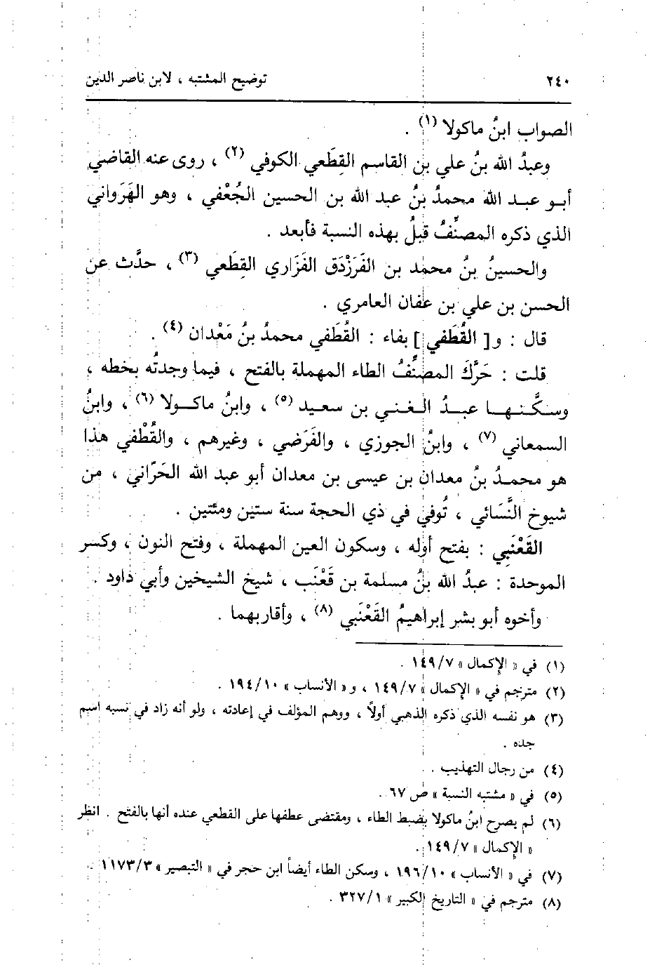 الصَّوَاب ابْن مَاكُولَا. وَعبد الله بن عَليّ بن الْقَاسِم الْقطعِي الْكُوفِي روى عَنهُ القَاضِي أَبُو عبد الله مُحَمَّد بن عبد الله بن الْحُسَيْن الْجعْفِيّ وَهُوَ الهرواني الَّذِي ذكره المُصَنّف قبل بِهَذِهِ النِّسْبَة فأبعد. وَالْحُسَيْن بن مُحَمَّد بن الفرزدق الْفَزارِيّ الْقطعِي حدث عَن الْحسن بن عَليّ بن عَفَّان العامري. قَالَ: و [القطفي] بفاء: القطفي مُحَمَّد بن معدان. قلت: حرك المُصَنّف الطَّاء الْمُهْملَة بِالْفَتْح فِيمَا وجدته بِخَطِّهِ وسكنها عبد الْغَنِيّ بن سعيد وَابْن مَاكُولَا وَابْن السَّمْعَانِيّ وَابْن الْجَوْزِيّ والفرضي وَغَيرهم والقطفي هَذَا هُوَ مُحَمَّد بن معدان بن عِيسَى بن معدان أَبُو عبد الله الْحَرَّانِي من شُيُوخ النَّسَائِيّ توفّي فِي ذِي الْحجَّة سنة سِتِّينَ ومئتين. القعْنبِي: بِفَتْح أَوله وَسُكُون الْعين الْمُهْملَة وَفتح النُّون وَكسر الْمُوَحدَة: عبد الله بن مسلمة بن قعنب شيخ الشَّيْخَيْنِ وَأبي دَاوُد. وَأَخُوهُ أَبُو بشر إِبْرَاهِيم القعْنبِي وأقاربهما.