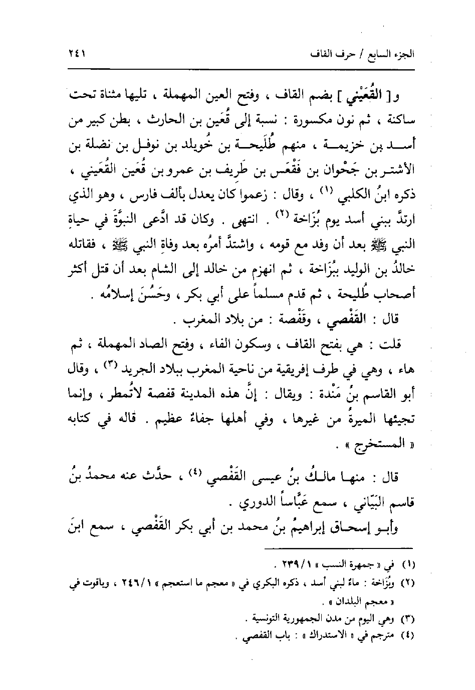 و [القعيني] بِضَم الْقَاف وَفتح الْعين الْمُهْملَة تَلِيهَا مثناة تَحت سَاكِنة ثمَّ نون مَكْسُورَة: نِسْبَة إِلَى قعين بن الحاث بطن كَبِير من أَسد بن خُزَيْمَة مِنْهُم طليحة بن خويلد بن نَوْفَل بن نَضْلَة بن الأشتر بن جحوان بن فقعس بن طريف بن عَمْرو بن قعين القعيني ذكره ابْن الْكَلْبِيّ وَقَالَ: زَعَمُوا كَانَ يعدل بِأَلف فَارس وَهُوَ الَّذِي ارْتَدَّ ببني أَسد يَوْم بزاخة. انْتهى. وَكَانَ قد ادّعى النُّبُوَّة فِي حَيَاة النَّبِي صلى الله عَلَيْهِ وَسلم بعد أَن وَفد مَعَ قومه وَاشْتَدَّ أمره بعد وَفَاة النَّبِي صلى الله عَلَيْهِ وَسلم فقاتله خَالِد بن الْوَلِيد ببزاخة ثمَّ انهزم من خَالِد إِلَى الشَّام بعد أَن قتل أَكثر أَصْحَاب طليحة ثمَّ قدم مُسلما على أبي بكر وَحسن إِسْلَامه. قَالَ: القفصي وقفصة: من بِلَاد الْمغرب. قلت: هِيَ بِفَتْح الْقَاف وَسُكُون الْفَاء وَفتح الصَّاد الْمُهْملَة ثمَّ هَاء وَهِي فِي طرف إفريقية من نَاحيَة الْمغرب بِبِلَاد الجريد وَقَالَ أَبُو الْقَاسِم بن مندة: وَيُقَال: إِن هَذِه الْمَدِينَة قفصة لَا تمطر وَإِنَّمَا تجيئها الْميرَة من غَيرهَا وَفِي أَهلهَا جفَاء عَظِيم. قَالَه فِي كِتَابه الْمُسْتَخْرج. قَالَ: مِنْهَا مَالك بن عِيسَى القفصي حدث عَنهُ مُحَمَّد بن قَاسم الْبَيَانِي سمع عباسا الدوري. وَأَبُو إِسْحَاق إِبْرَاهِيم بن مُحَمَّد بن أبي بكر القفصي سمع ابْن