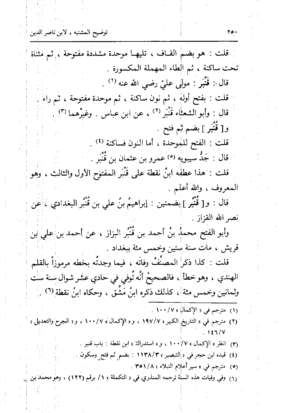 قلت: هُوَ بِضَم الْقَاف تَلِيهَا مُوَحدَة مُشَدّدَة مَفْتُوحَة ثمَّ مثناة تَحت سَاكِنة ثمَّ الطَّاء الْمُهْملَة الْمَكْسُورَة. قَالَ: قنبر: مولى عَليّ رَضِي الله عَنهُ. قلت: بِفَتْح أَوله ثمَّ نون سَاكِنة ثمَّ مُوَحدَة مَفْتُوحَة ثمَّ رَاء. قَالَ: وَأَبُو الشعْثَاء قنبر عَن ابْن عَبَّاس وَغَيرهمَا. و [قنبر] بِضَم ثمَّ فتح. قلت: الْفَتْح للموحدة أما النُّون فساكنة. قَالَ: جد سِيبَوَيْهٍ عَمْرو بن عُثْمَان بن قنبر. قلت: هَذَا عطفه ابْن نقطة على قنبر المفتوح الأول وَالثَّالِث وَهُوَ الْمَعْرُوف وَالله أعلم. قَالَ: و [قنبر] بِضَمَّتَيْنِ إِبْرَاهِيم بن عَليّ بن قنبر الْبَغْدَادِيّ عَن نصر الله الْقَزاز. وَأَبُو الْفَتْح مُحَمَّد بن أَحْمد بن قنبر الْبَزَّاز عَن أَحْمد بن عَليّ بن قُرَيْش مَاتَ سنة سِتِّينَ وَخمْس مئة بِبَغْدَاد. قلت: كَذَا ذكر المُصَنّف وَفَاته فِيمَا وجدته بِخَطِّهِ مرموزا بالقلم الْهِنْدِيّ وَهُوَ خطأ فَالصَّحِيح أَنه توفّي فِي حادي عشر شَوَّال سنة سِتّ وَثَمَانِينَ وَخمْس مئة كَذَلِك ذكره ابْن مشق وَحَكَاهُ ابْن نقطة.