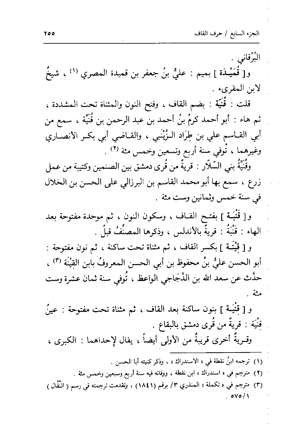 البرقاني. و [قميدة] بميم: عَليّ بن جَعْفَر بن قميدة الْمصْرِيّ شيخ لِابْنِ الْمُقْرِئ. قلت: قنية: بِضَم الْقَاف وَفتح النُّون والمثناة تَحت الْمُشَدّدَة ثمَّ هَاء: أَبُو أَحْمد كرم بن أَحْمد بن عبد الرَّحْمَن بن قنية سمع من أبي الْقَاسِم عَليّ بن طراد الزَّيْنَبِي وَالْقَاضِي أبي بكر الْأنْصَارِيّ وَغَيرهمَا توفّي سنة أَربع وَتِسْعين وَخمْس مئة. وقنية بني السلار: قَرْيَة من قرى دمشق بَين الصنمين وكتيبة من عمل زرع سمع بهَا أَبُو مُحَمَّد الْقَاسِم بن البرزالي على الْحسن بن الْخلال فِي سنة خمس وَثَمَانِينَ وست مئة. و [قنبة] بِفَتْح الْقَاف وَسُكُون النُّون ثمَّ مُوَحدَة مَفْتُوحَة بعد الْهَاء: قنبة: قَرْيَة بالأندلس وَذكرهَا المُصَنّف قبل. و [قينة] بِكَسْر الْقَاف ثمَّ مثناة تَحت سَاكِنة ثمَّ نون مَفْتُوحَة: أَبُو الْحسن عَليّ بن مَحْفُوظ بن أبي الْحسن الْمَعْرُوف بِابْن الْقَيْنَة حدث عَن سعد الله بن الدجاجي الْوَاعِظ توفّي سنة ثَمَان عشرَة وست مئة. و [قنية] بنُون سَاكِنة بعد الْقَاف ثمَّ مثناة تَحت مَفْتُوحَة: عين قنية: قَرْيَة من قرى دمشق بالبقاع. وقرية أُخْرَى قريبَة من الأولى أَيْضا يُقَال لإحداهما: الْكُبْرَى